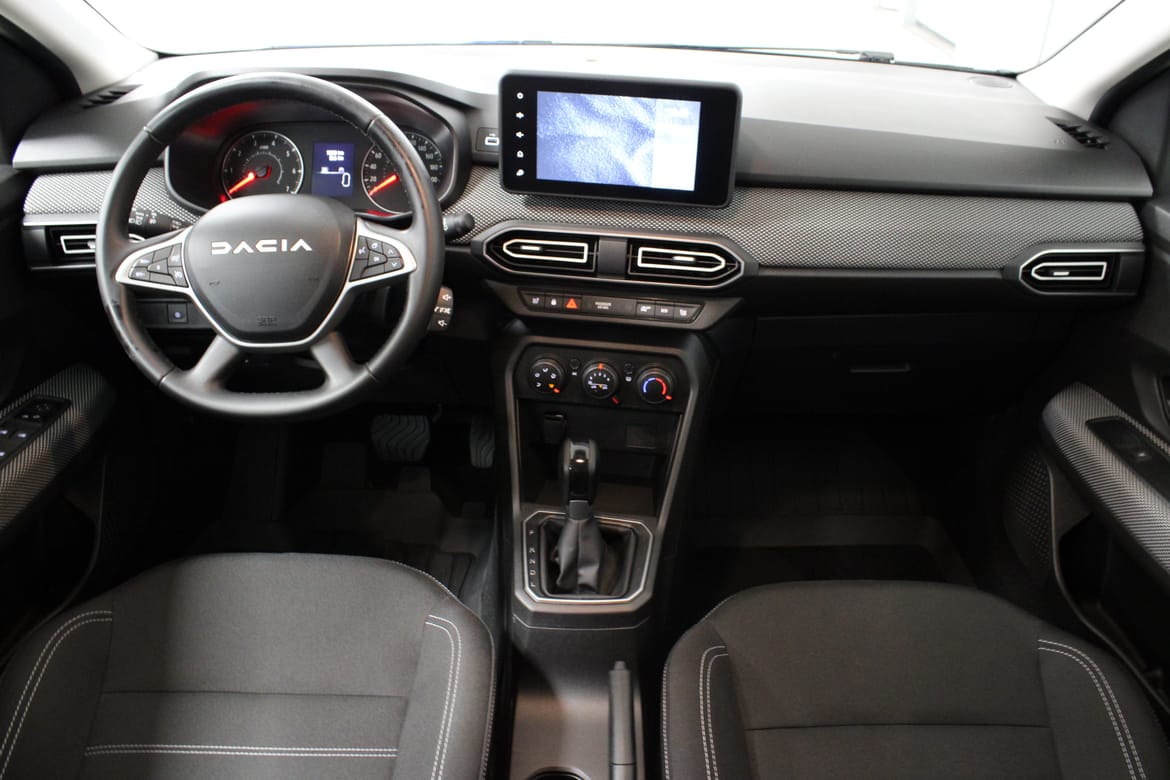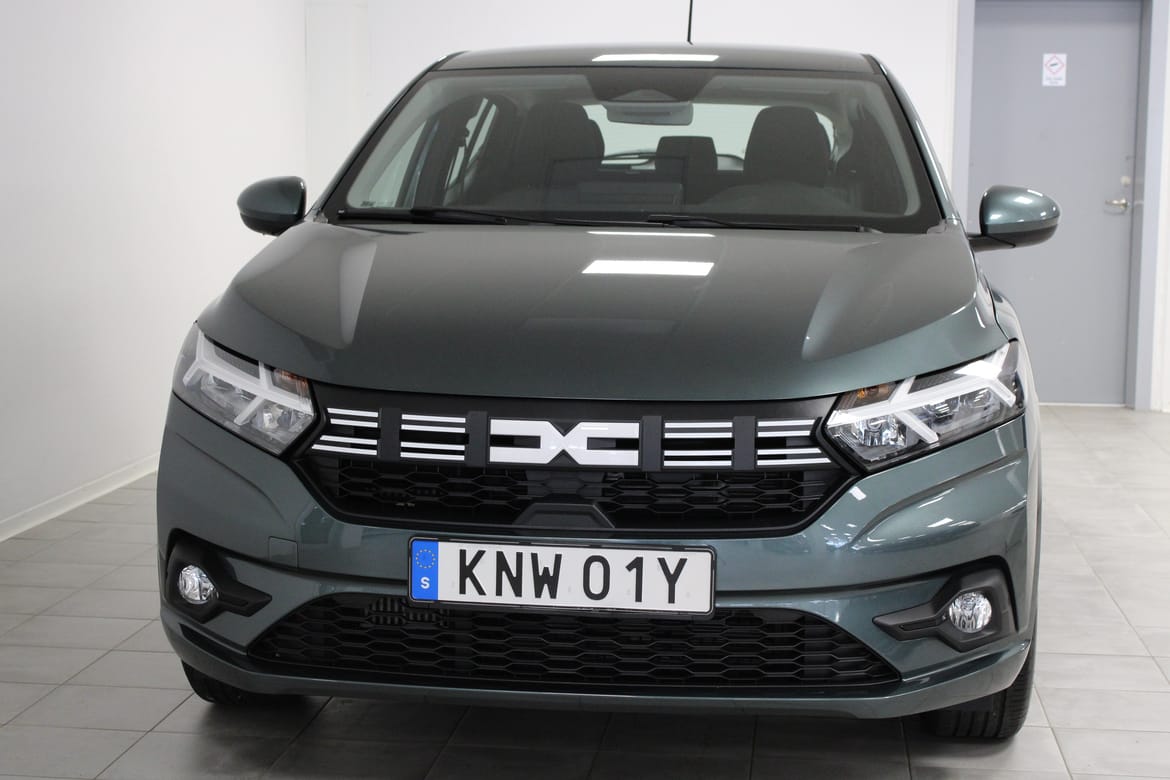 En grön begagnad Dacia Sandero som är tillverkad 2024 med årsmodell 2025 och har utrustningspaketet med 91 hk. Fordonet finns i Filipstad med reg. nummer KNW01Y, har automat-växellåda och mätarställning är 1.200 mil. Fordonet har totalt 5 st sittplatser och är kategoriserad som liten familjebil.