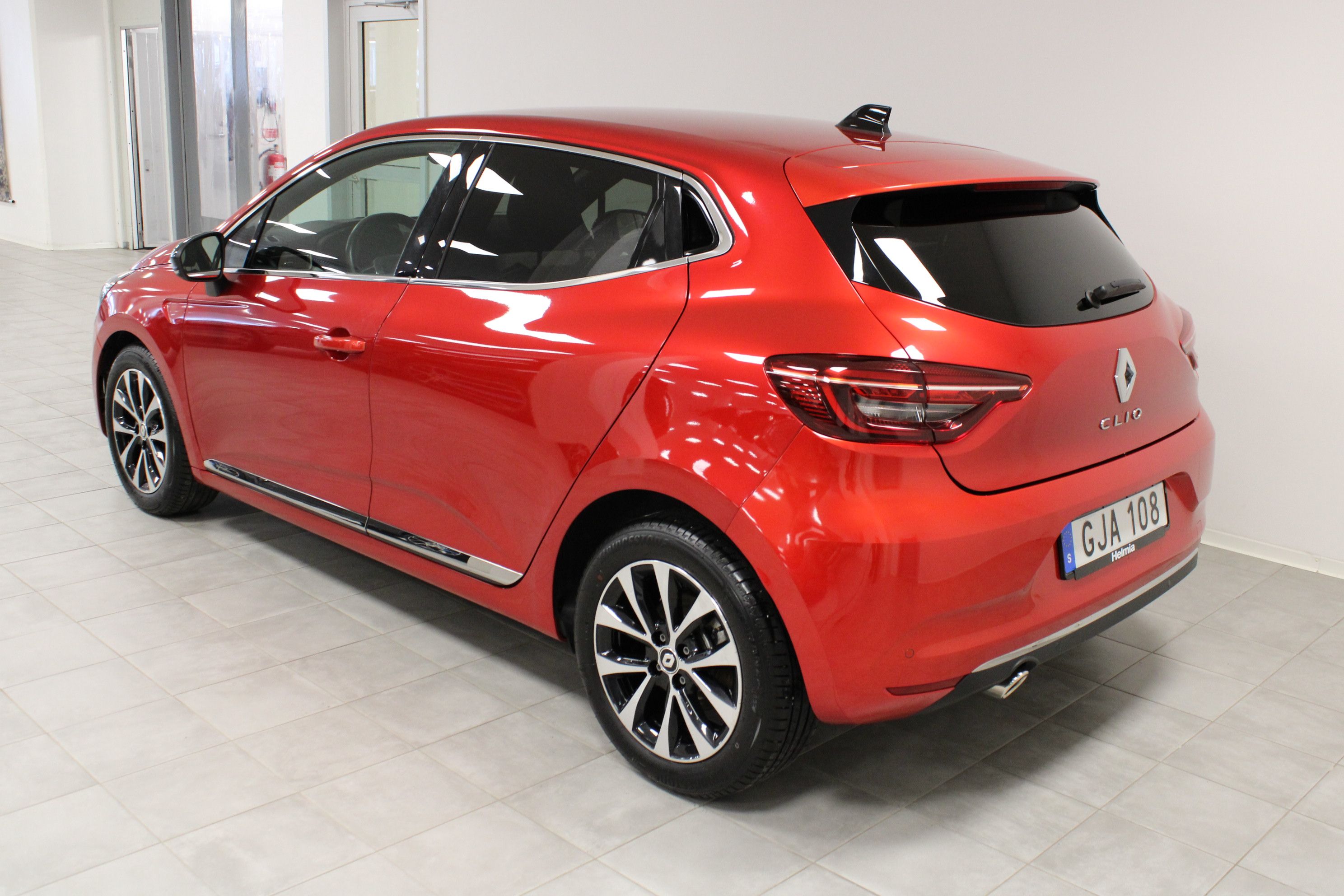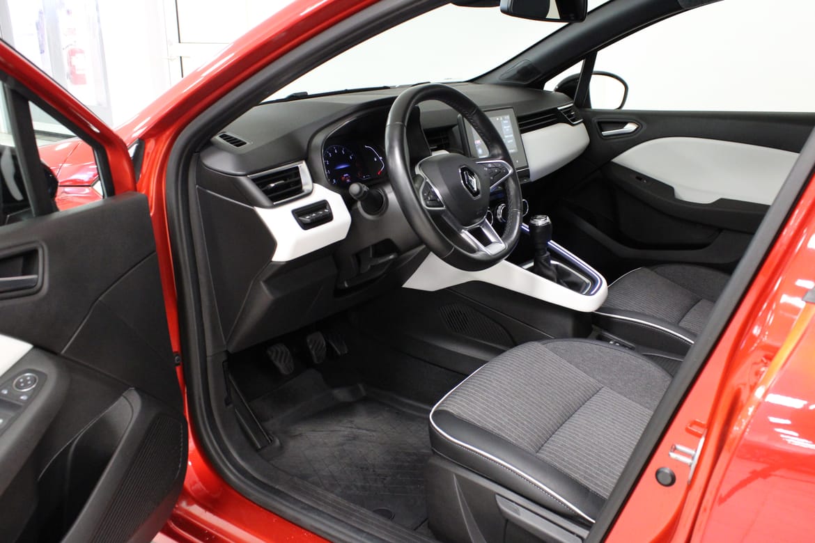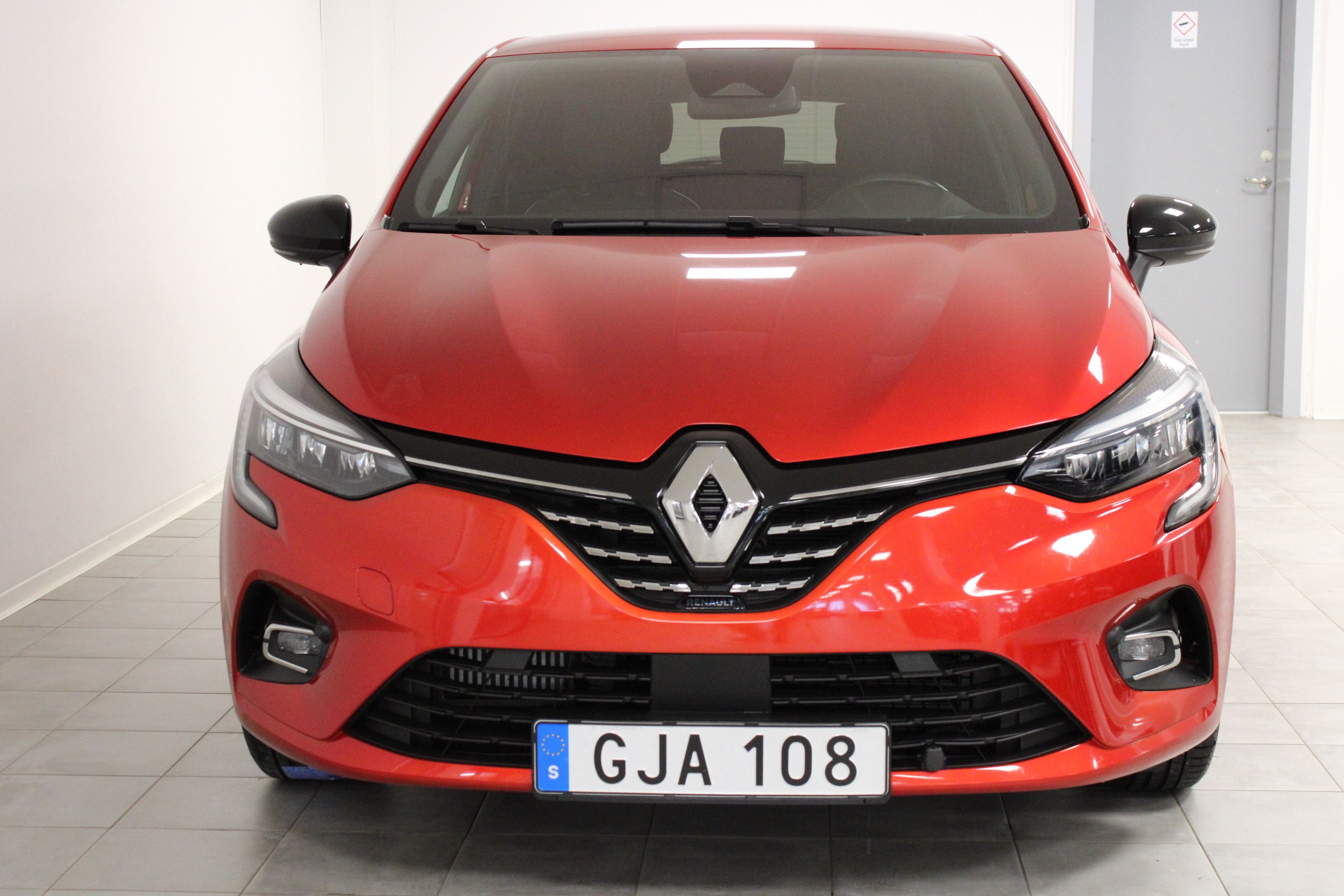 En röd begagnad Renault Clio som är tillverkad 2023 med årsmodell 2023 och har utrustningspaketet Intens med 91 hk. Fordonet finns i Filipstad med reg. nummer GJA108, har manuell-växellåda och mätarställning är 1.109 mil. Fordonet har totalt 5 st sittplatser och är kategoriserad som liten familjebil.