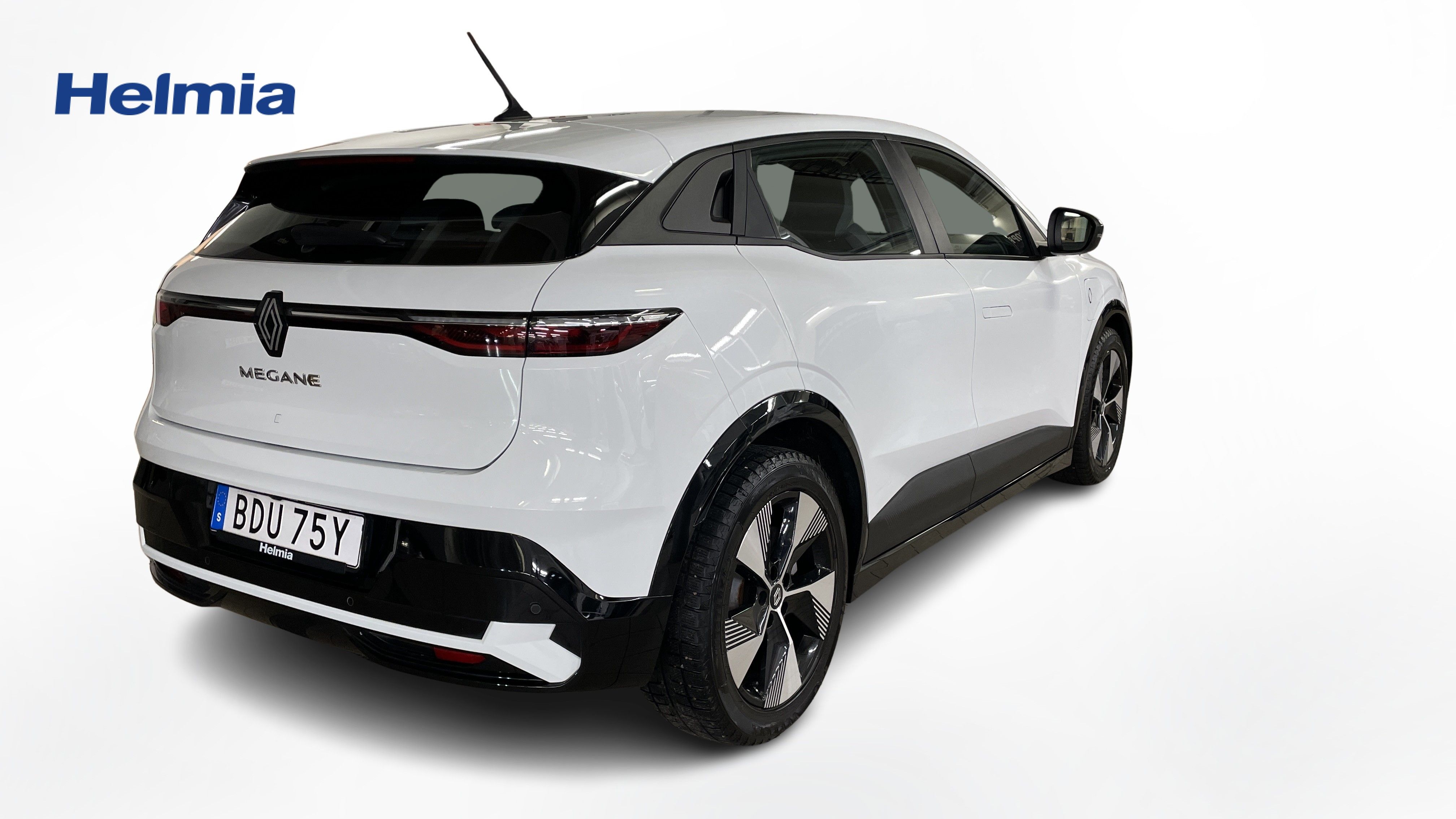 En vit begagnad Renault Mégane E-TECH som är tillverkad 2022 med årsmodell 2023 och har utrustningspaketet med 130 hk. Fordonet finns i Filipstad med reg. nummer BDU75Y, har automat-växellåda och mätarställning är 2.900 mil. Fordonet har totalt 5 st sittplatser och är kategoriserad som mellanstor familjebil.