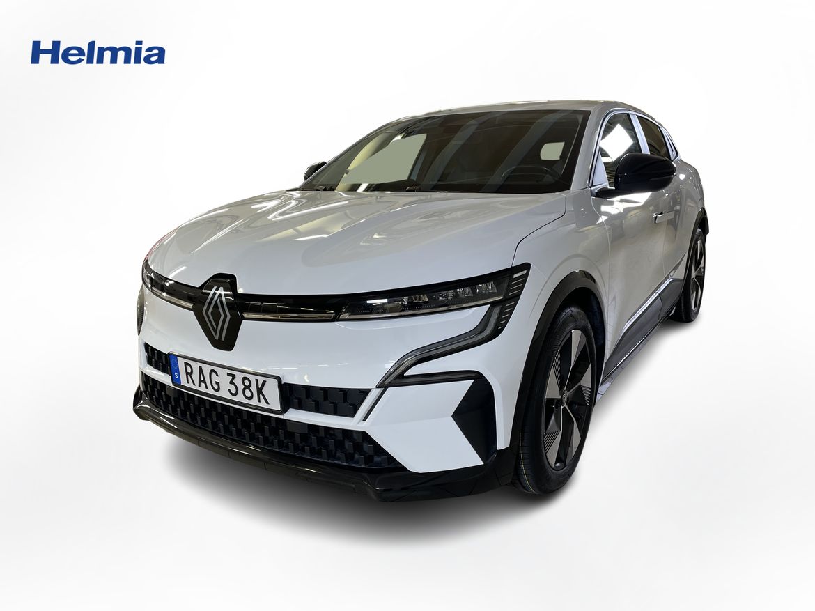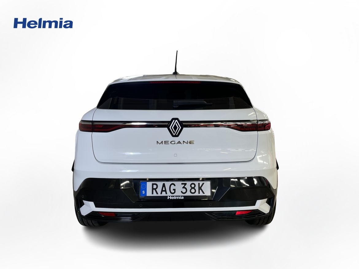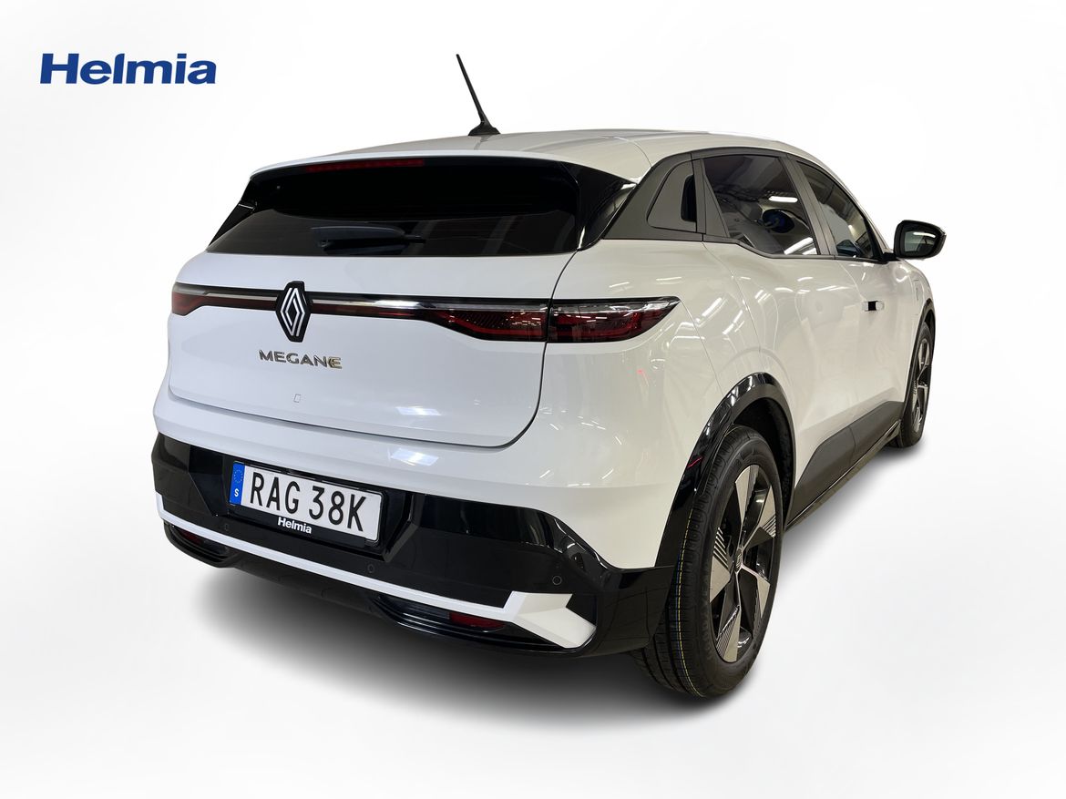 En vit begagnad Renault Mégane E-TECH som är tillverkad 2023 med årsmodell 2023 och har utrustningspaketet med 130 hk. Fordonet finns i Karlstad med reg. nummer RAG38K, har automat-växellåda och mätarställning är 5.400 mil. Fordonet har totalt 5 st sittplatser och är kategoriserad som mellanstor familjebil.