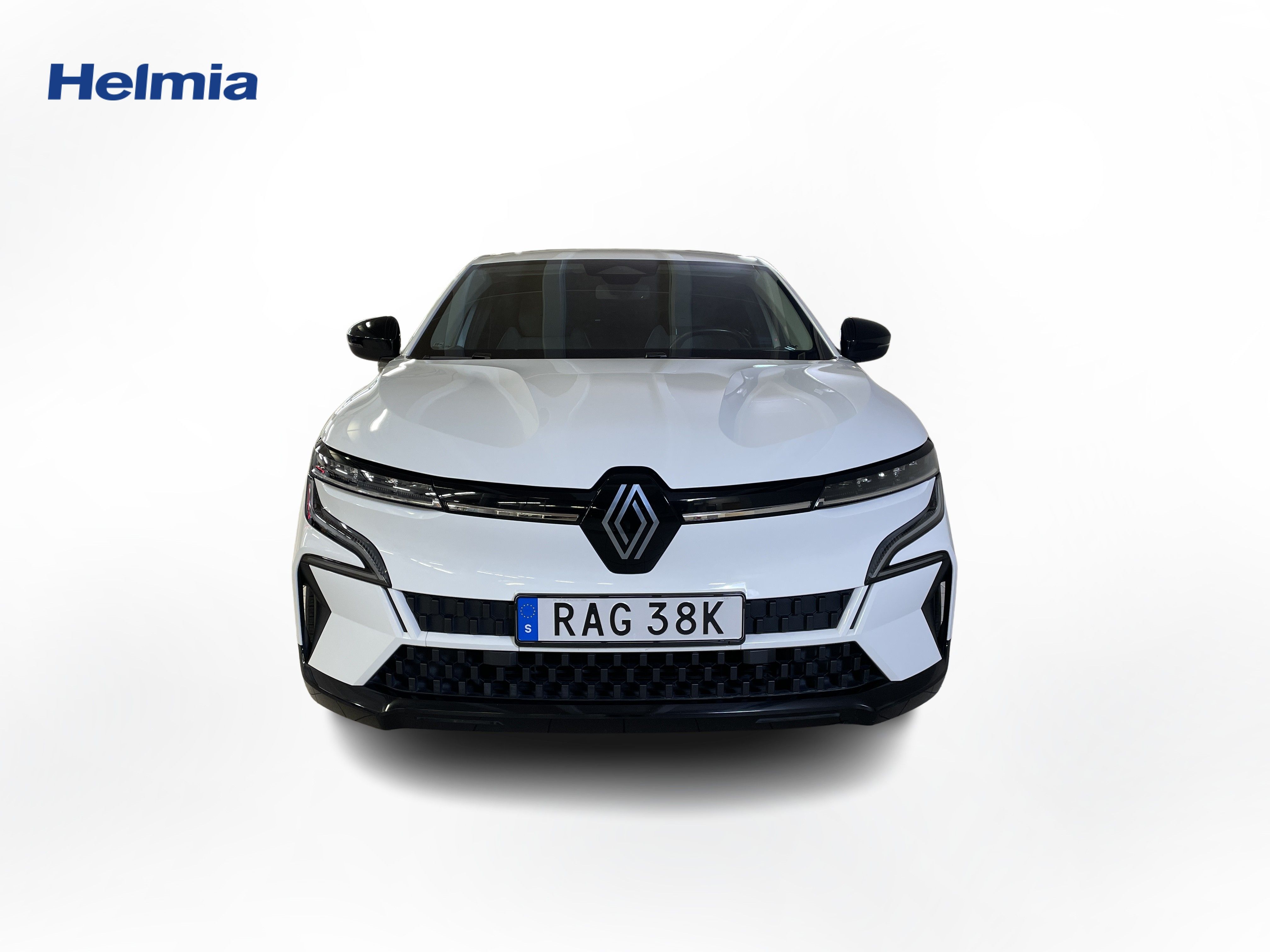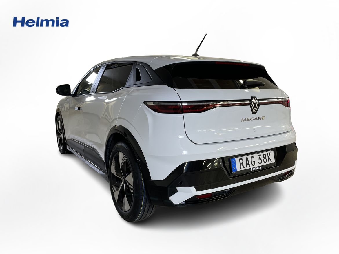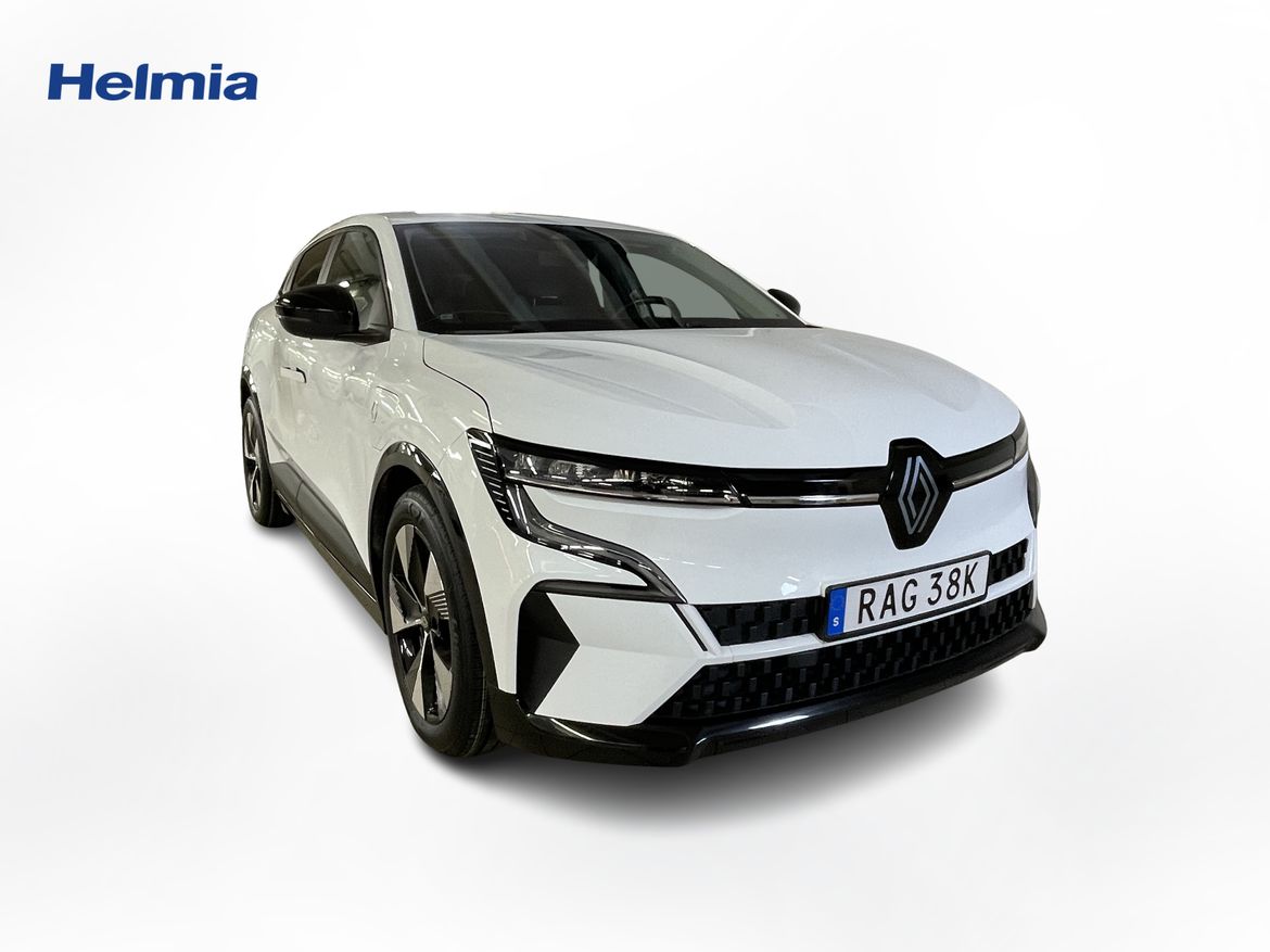 En vit begagnad Renault Mégane E-TECH som är tillverkad 2023 med årsmodell 2023 och har utrustningspaketet med 130 hk. Fordonet finns i Karlstad med reg. nummer RAG38K, har automat-växellåda och mätarställning är 5.400 mil. Fordonet har totalt 5 st sittplatser och är kategoriserad som mellanstor familjebil.