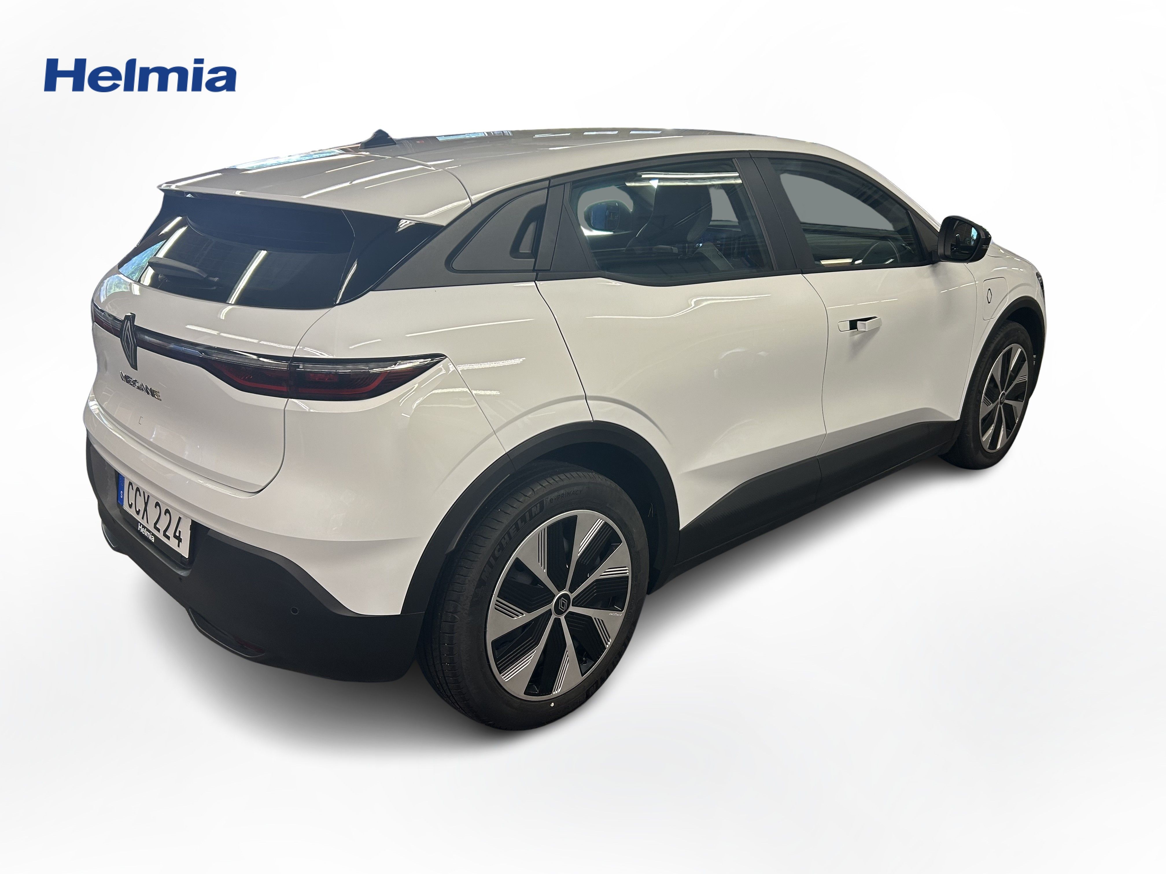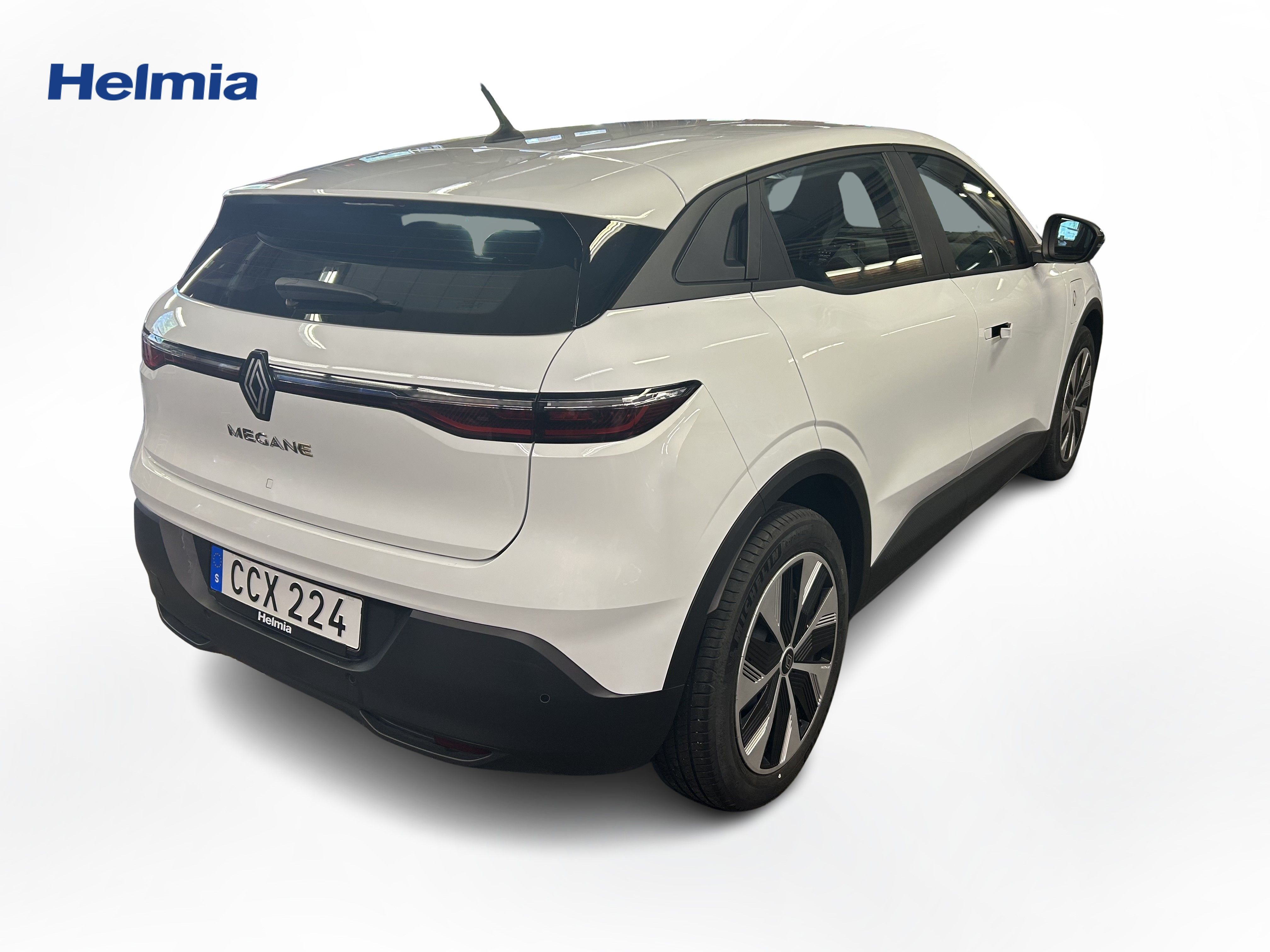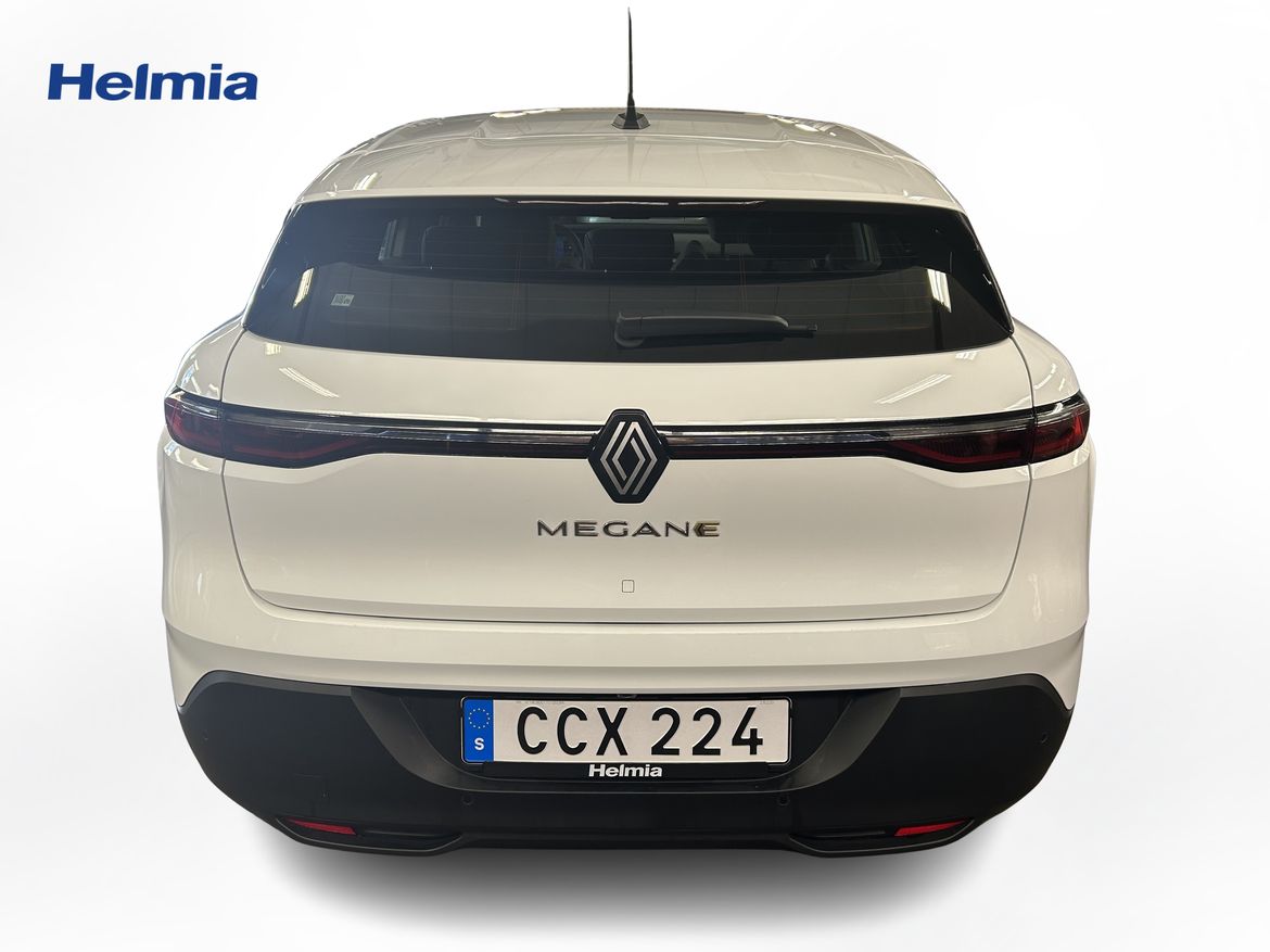 En vit begagnad Renault Mégane E-TECH som är tillverkad 2023 med årsmodell 2023 och har utrustningspaketet med 130 hk. Fordonet finns i Karlskoga med reg. nummer CCX224, har automat-växellåda och mätarställning är 2.780 mil. Fordonet har totalt 5 st sittplatser och är kategoriserad som mellanstor familjebil.