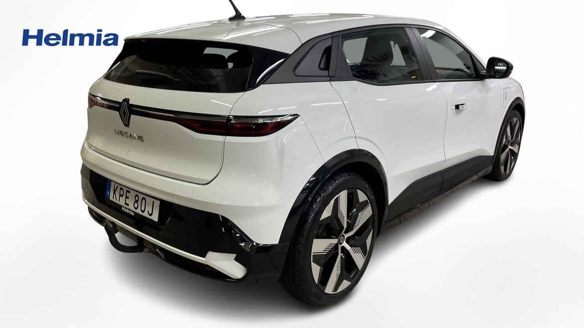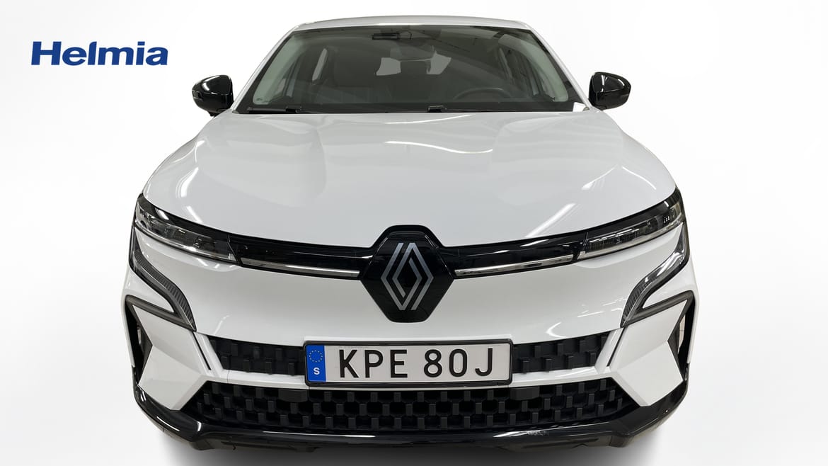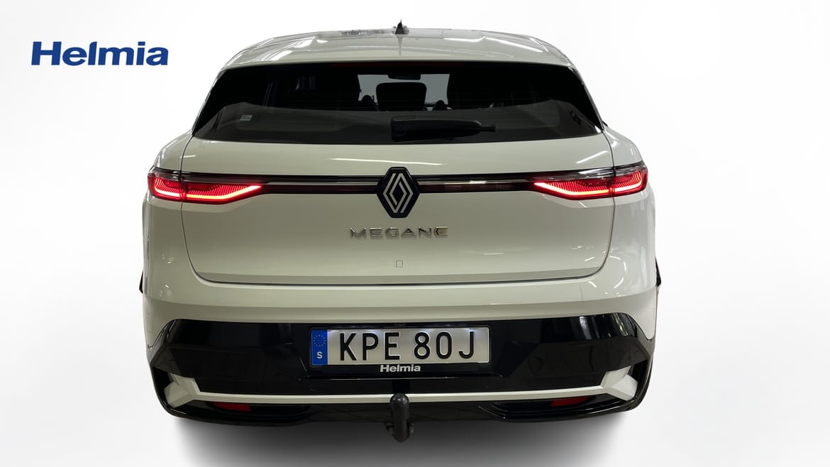 En vit begagnad Renault Mégane E-TECH som är tillverkad 2022 med årsmodell 2023 och har utrustningspaketet med 218 hk. Fordonet finns i Karlstad med reg. nummer KPE80J, har automat-växellåda och mätarställning är 1.207 mil. Fordonet har totalt 5 st sittplatser och är kategoriserad som mellanstor familjebil.