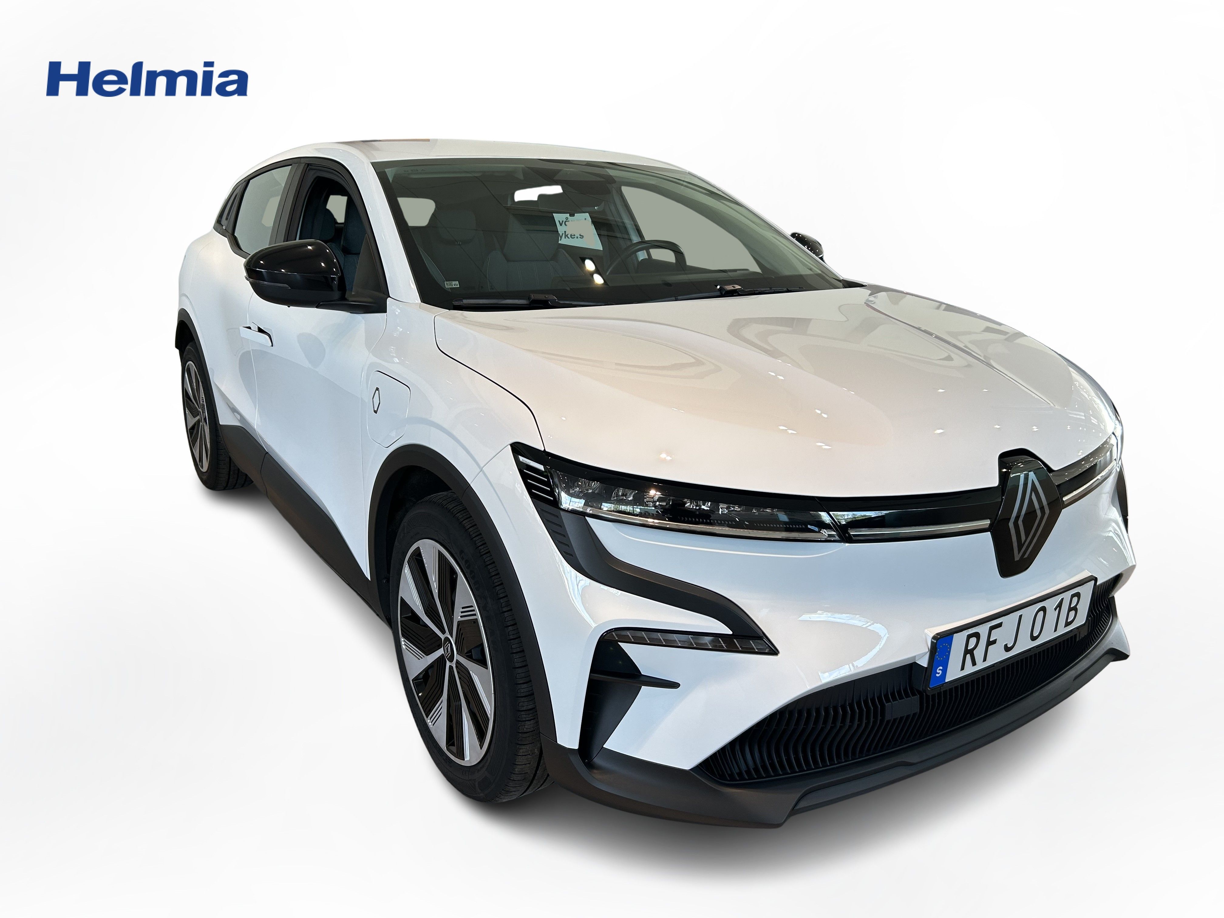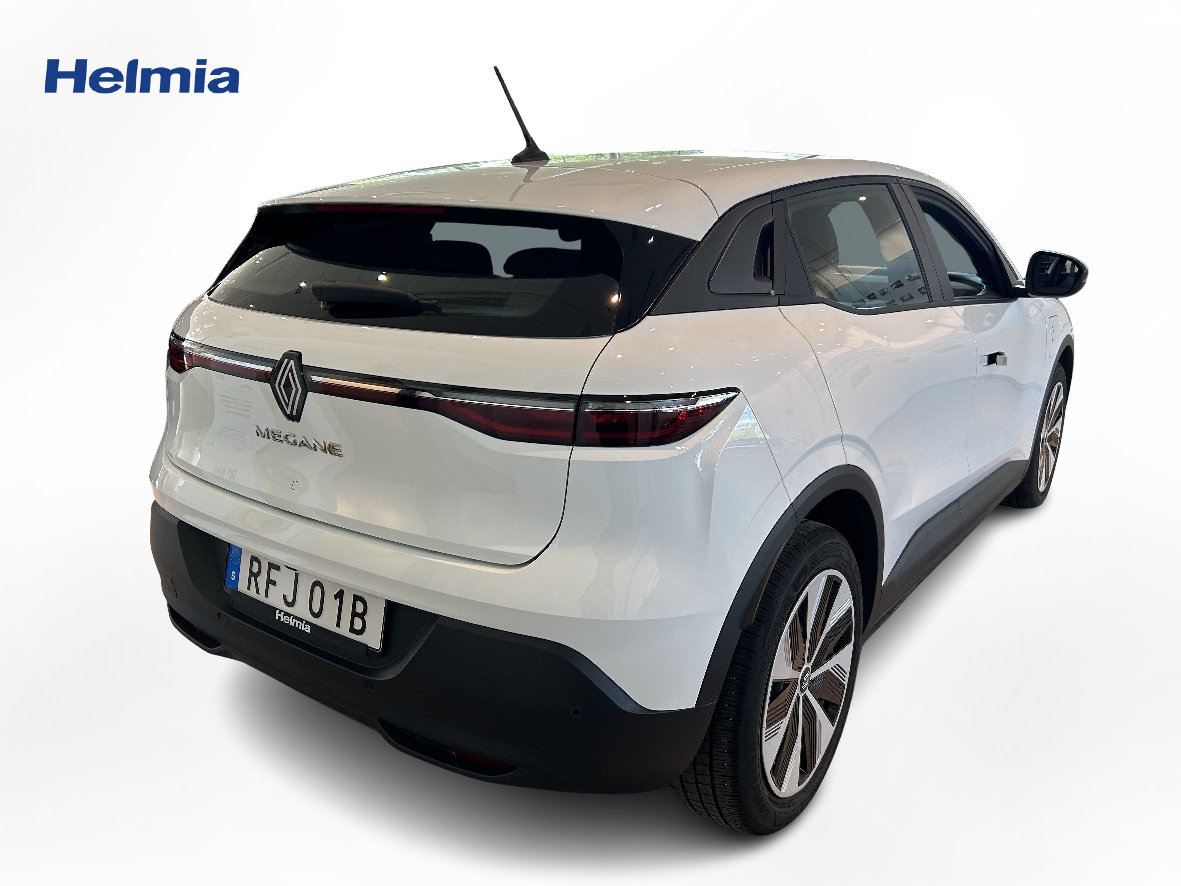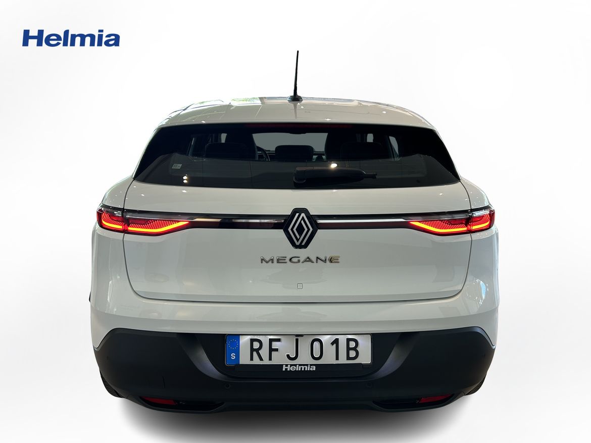 En vit begagnad Renault Mégane E-TECH som är tillverkad 2022 med årsmodell 2023 och har utrustningspaketet med 130 hk. Fordonet finns i Filipstad med reg. nummer RFJ01B, har automat-växellåda och mätarställning är 3.147 mil. Fordonet har totalt 5 st sittplatser och är kategoriserad som mellanstor familjebil.
