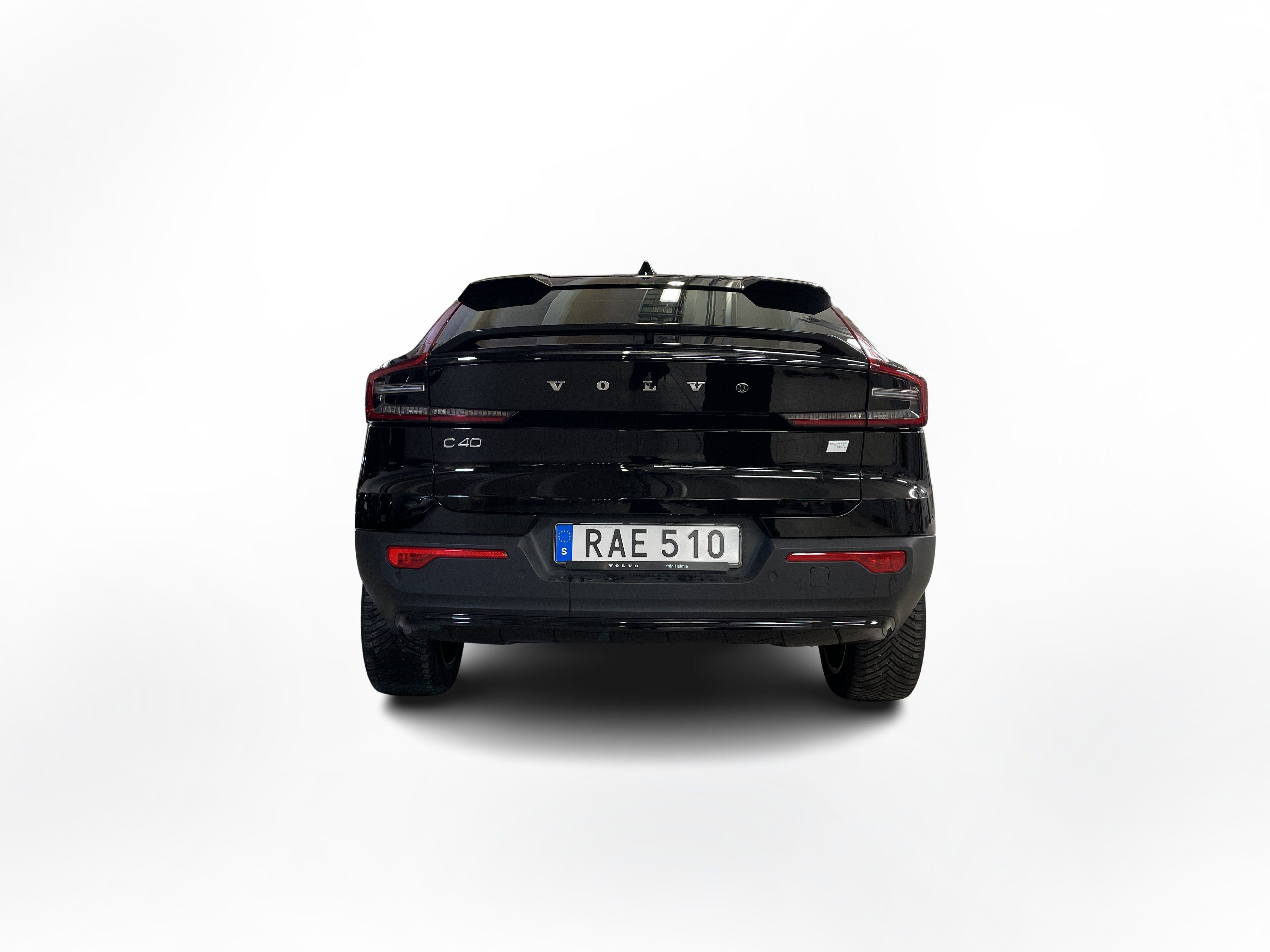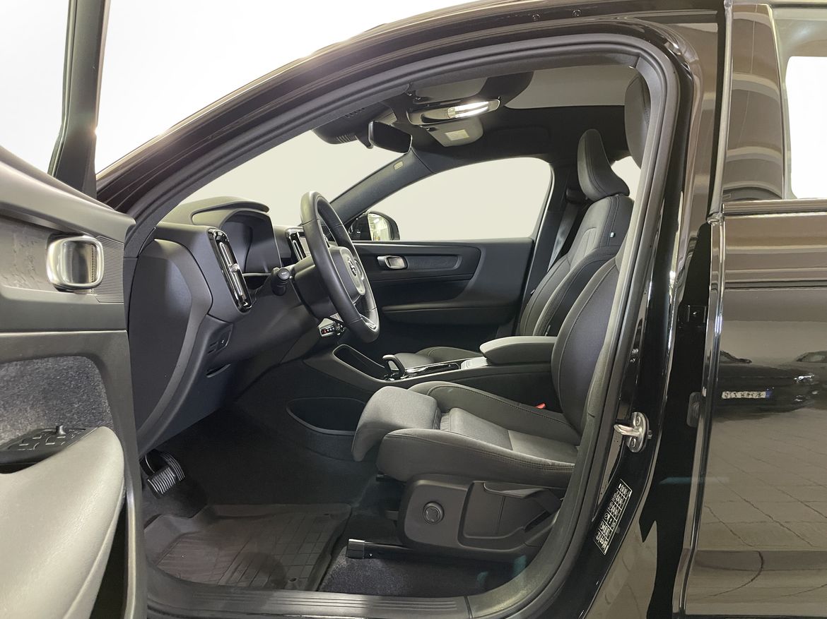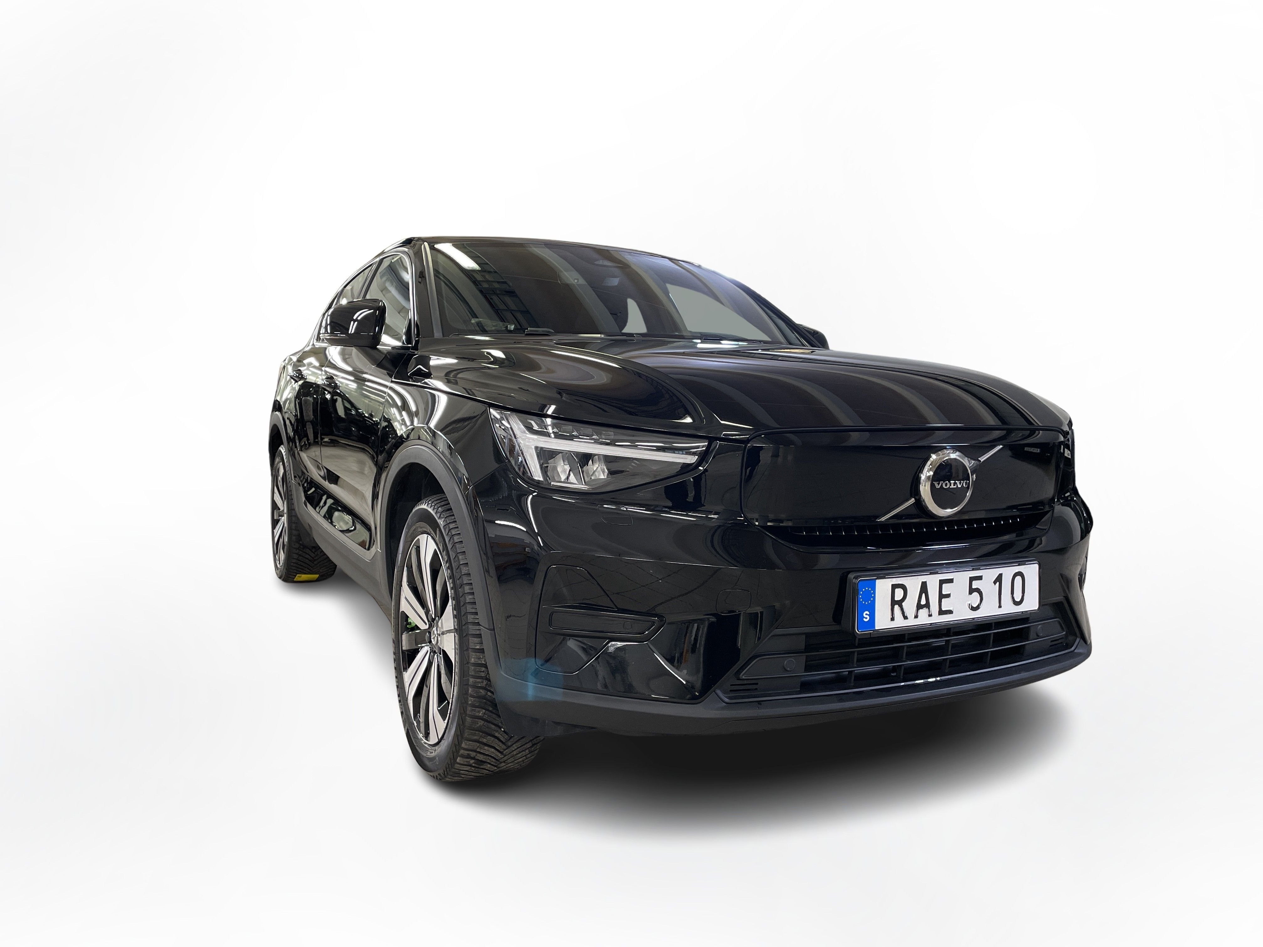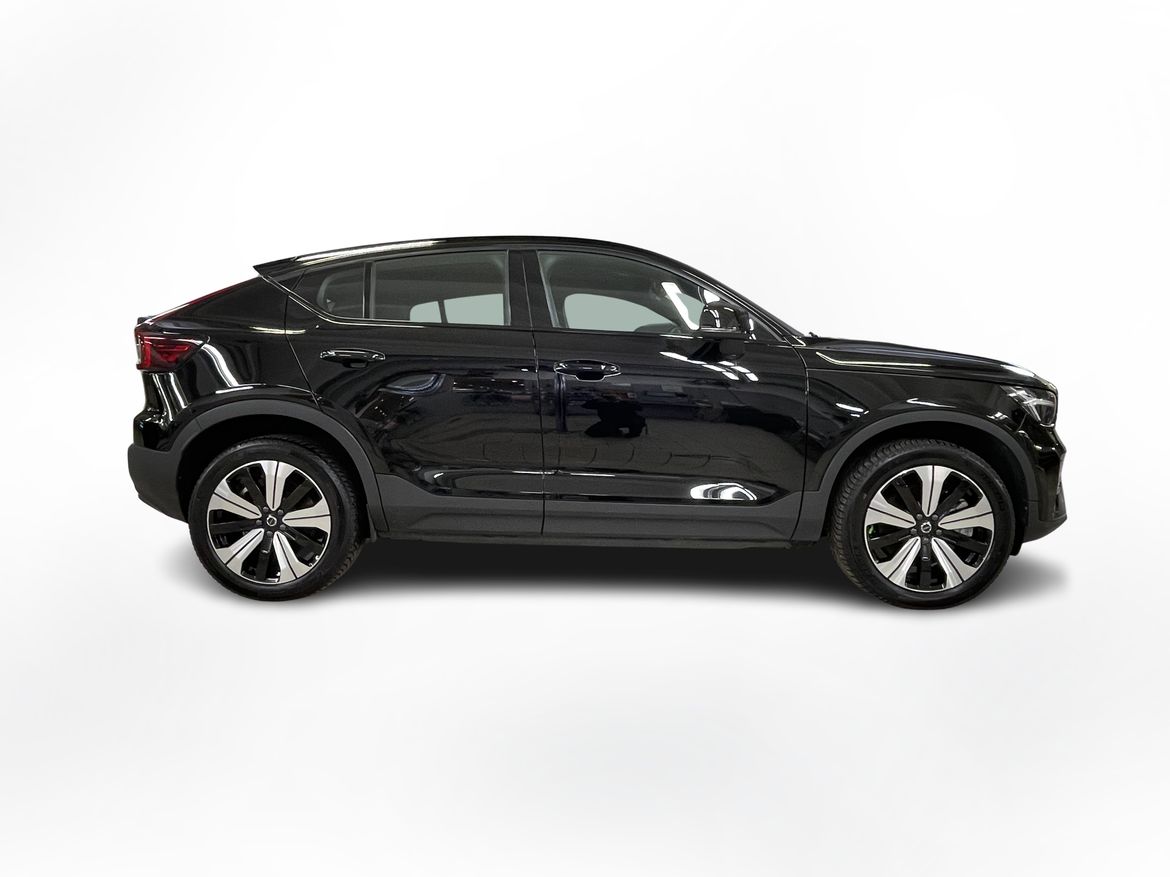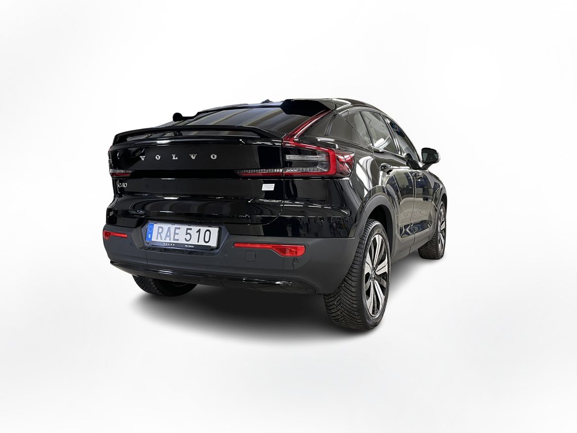 En svart begagnad Volvo C40 Recharge Twin motor som är tillverkad 2022 med årsmodell 2023 och har utrustningspaketet Core med 408 hk. Fordonet finns i Karlstad med reg. nummer RAE510, har automat-växellåda och mätarställning är 3.750 mil. Fordonet har totalt 5 st sittplatser och är kategoriserad som liten suv.