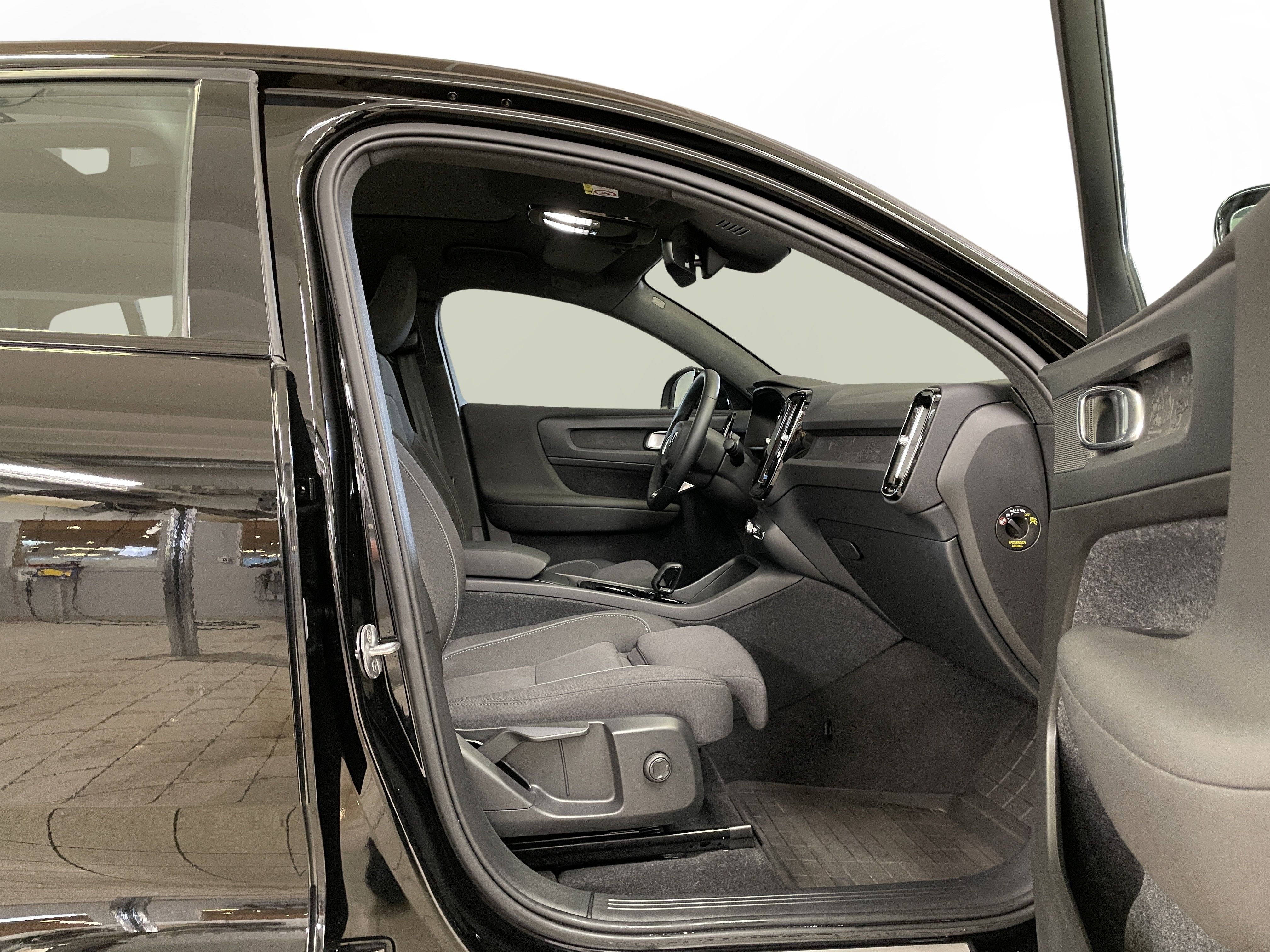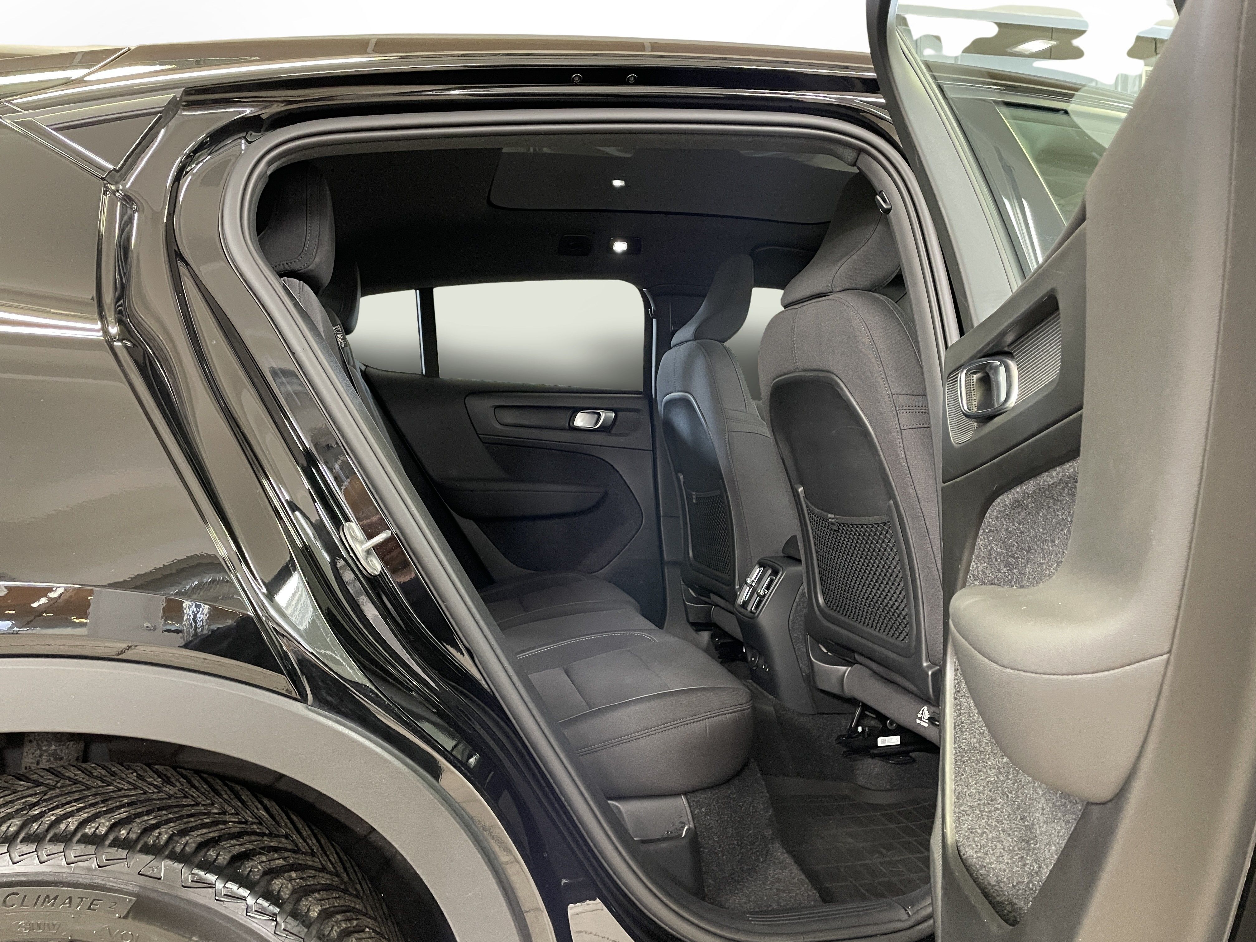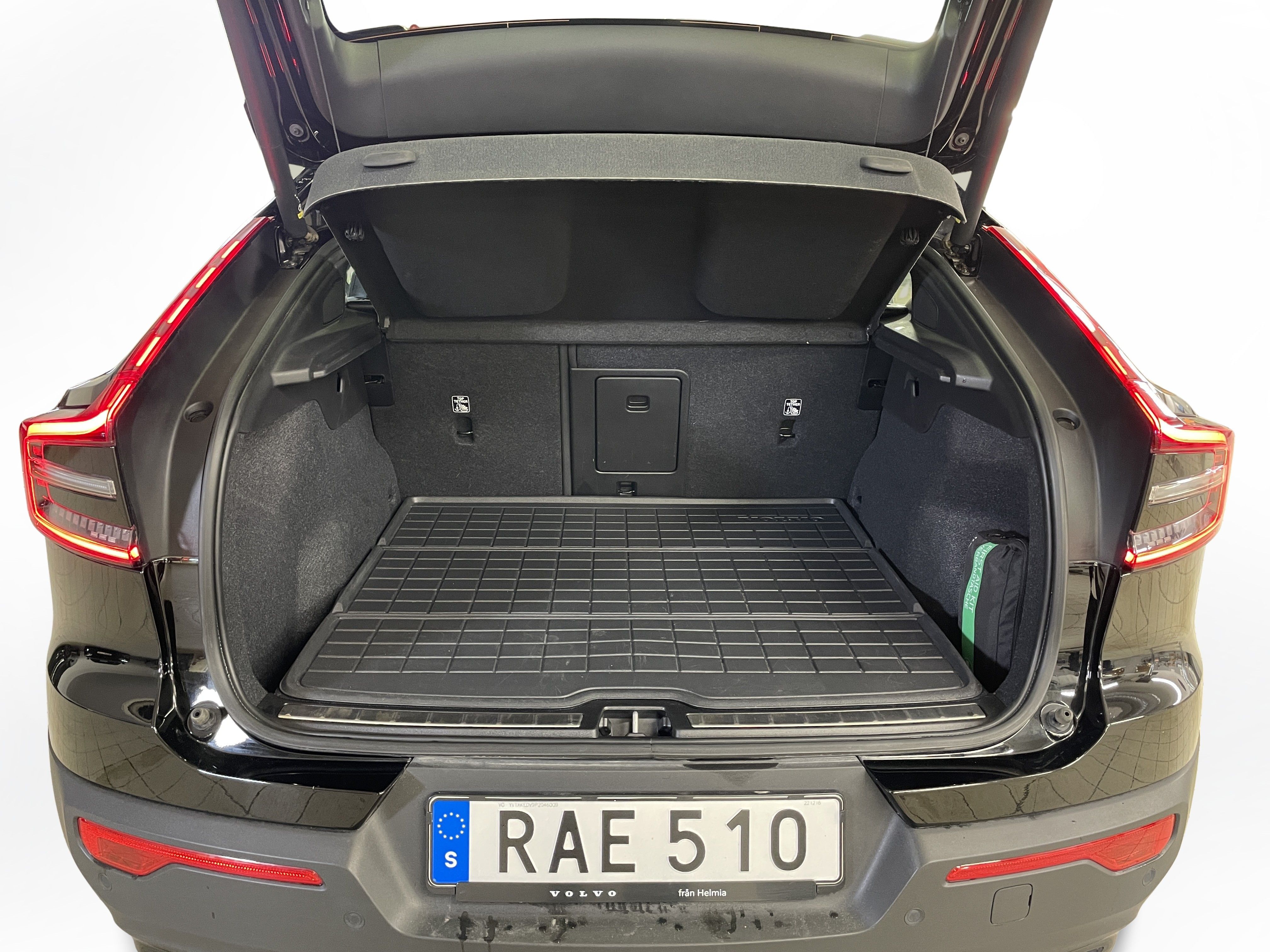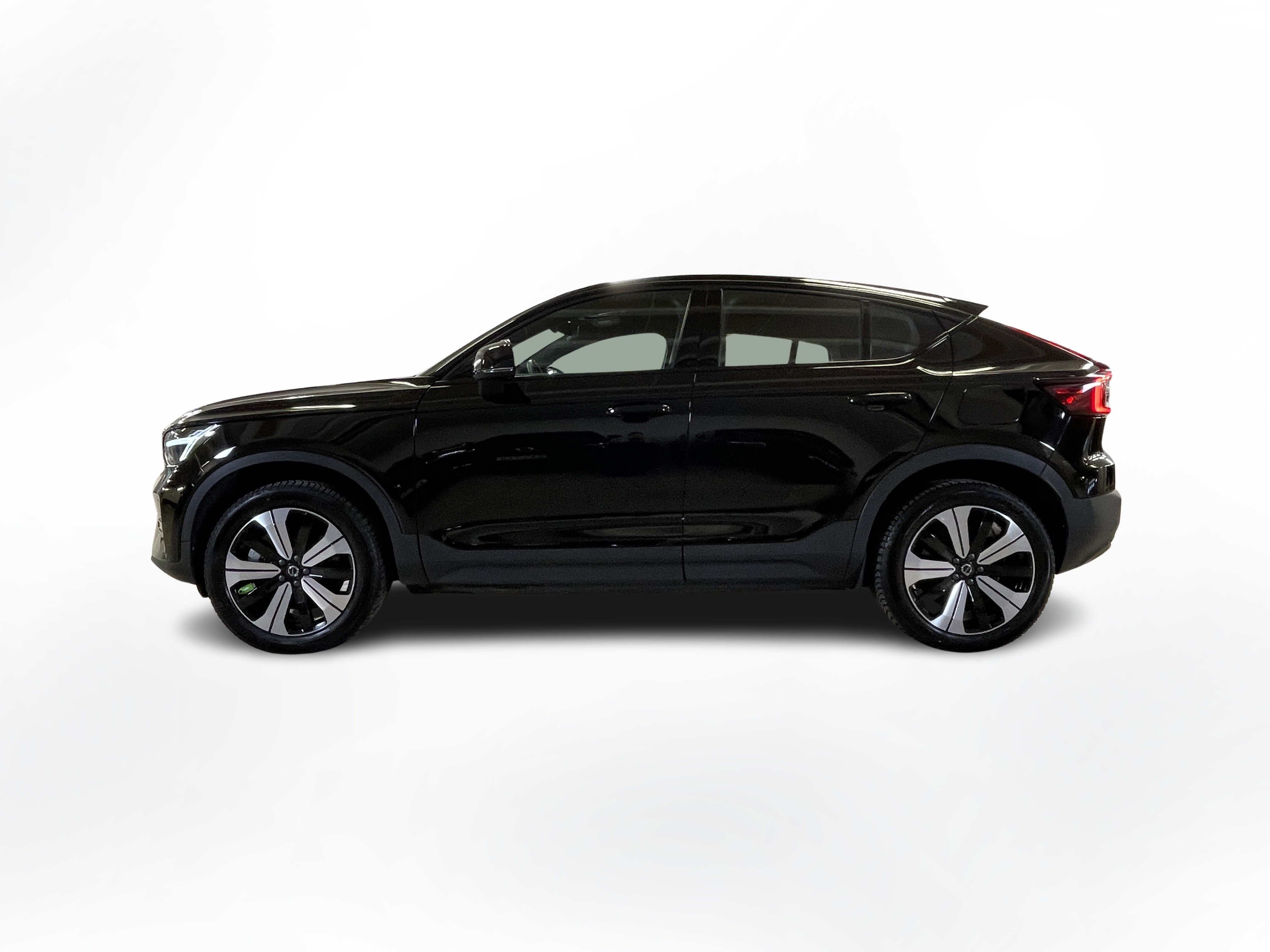 En svart begagnad Volvo C40 Recharge Twin motor som är tillverkad 2022 med årsmodell 2023 och har utrustningspaketet Core med 408 hk. Fordonet finns i Karlstad med reg. nummer RAE510, har automat-växellåda och mätarställning är 3.750 mil. Fordonet har totalt 5 st sittplatser och är kategoriserad som liten suv.