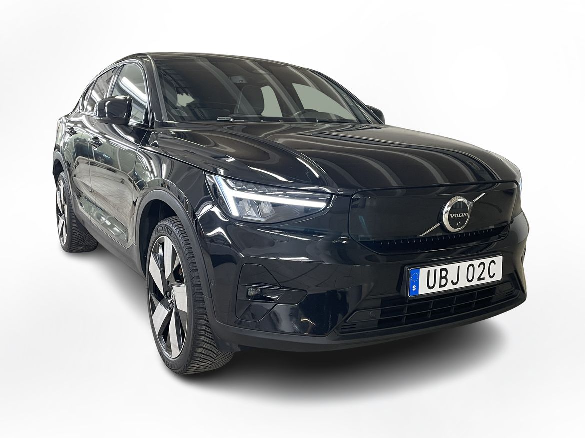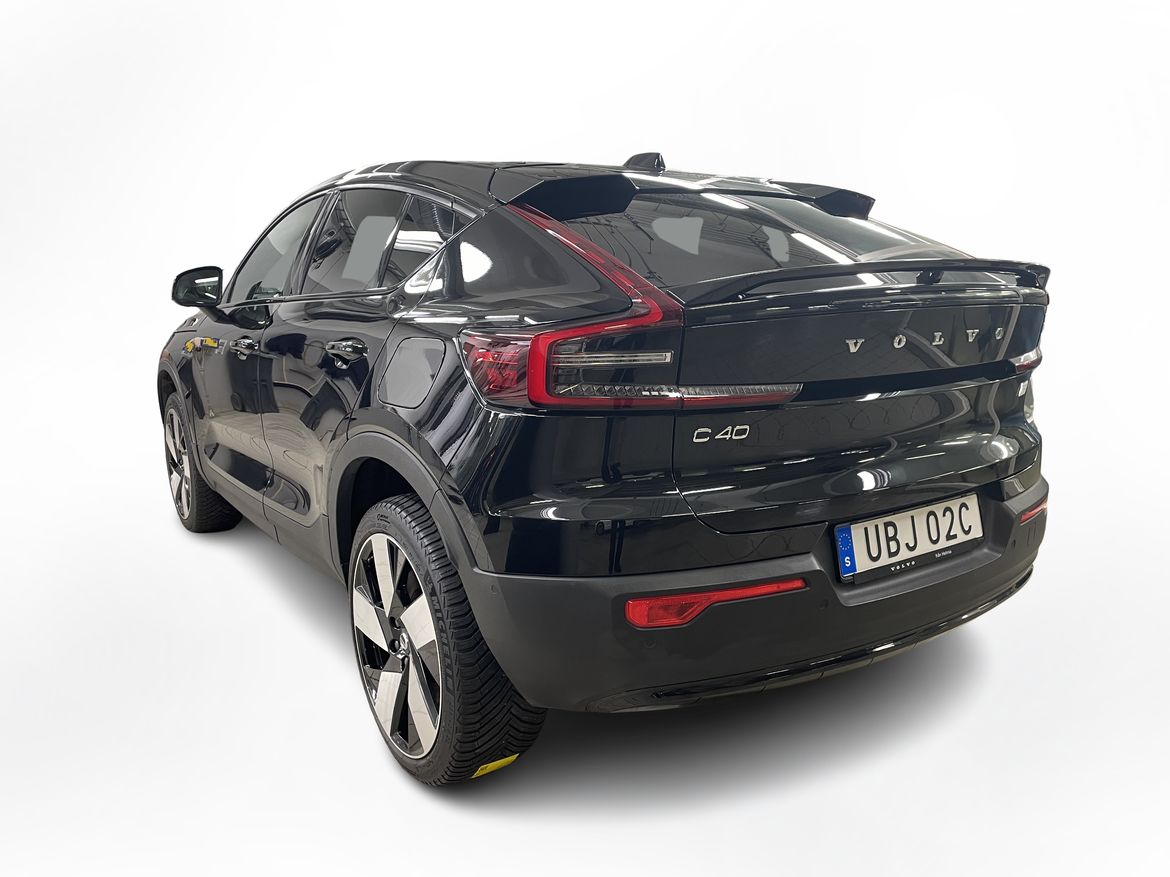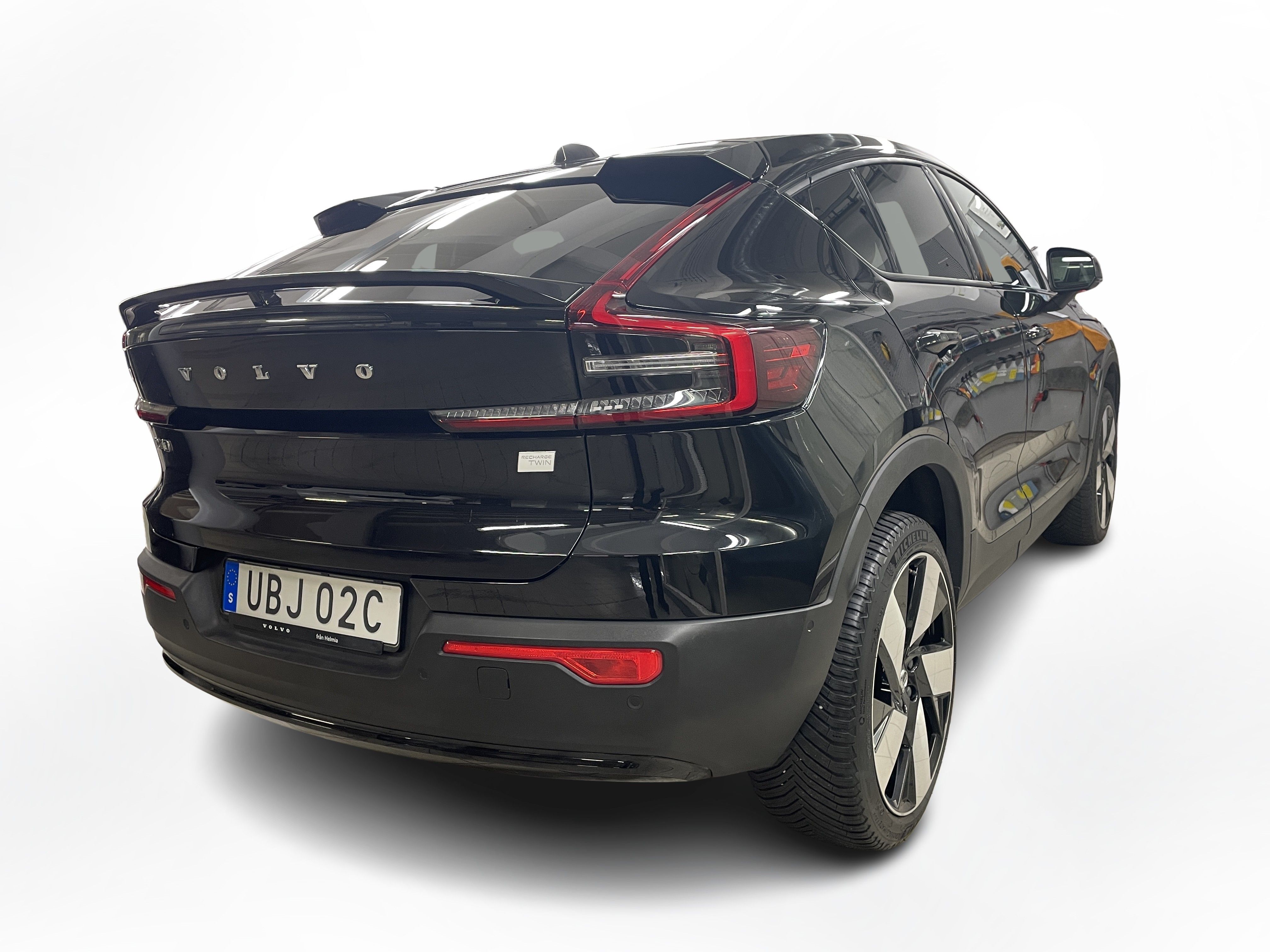 En svart begagnad Volvo C40 Recharge Twin motor som är tillverkad 2022 med årsmodell 2023 och har utrustningspaketet Ultimate med 408 hk. Fordonet finns i Karlstad med reg. nummer UBJ02C, har automat-växellåda och mätarställning är 6.886 mil. Fordonet har totalt 5 st sittplatser och är kategoriserad som liten suv.
