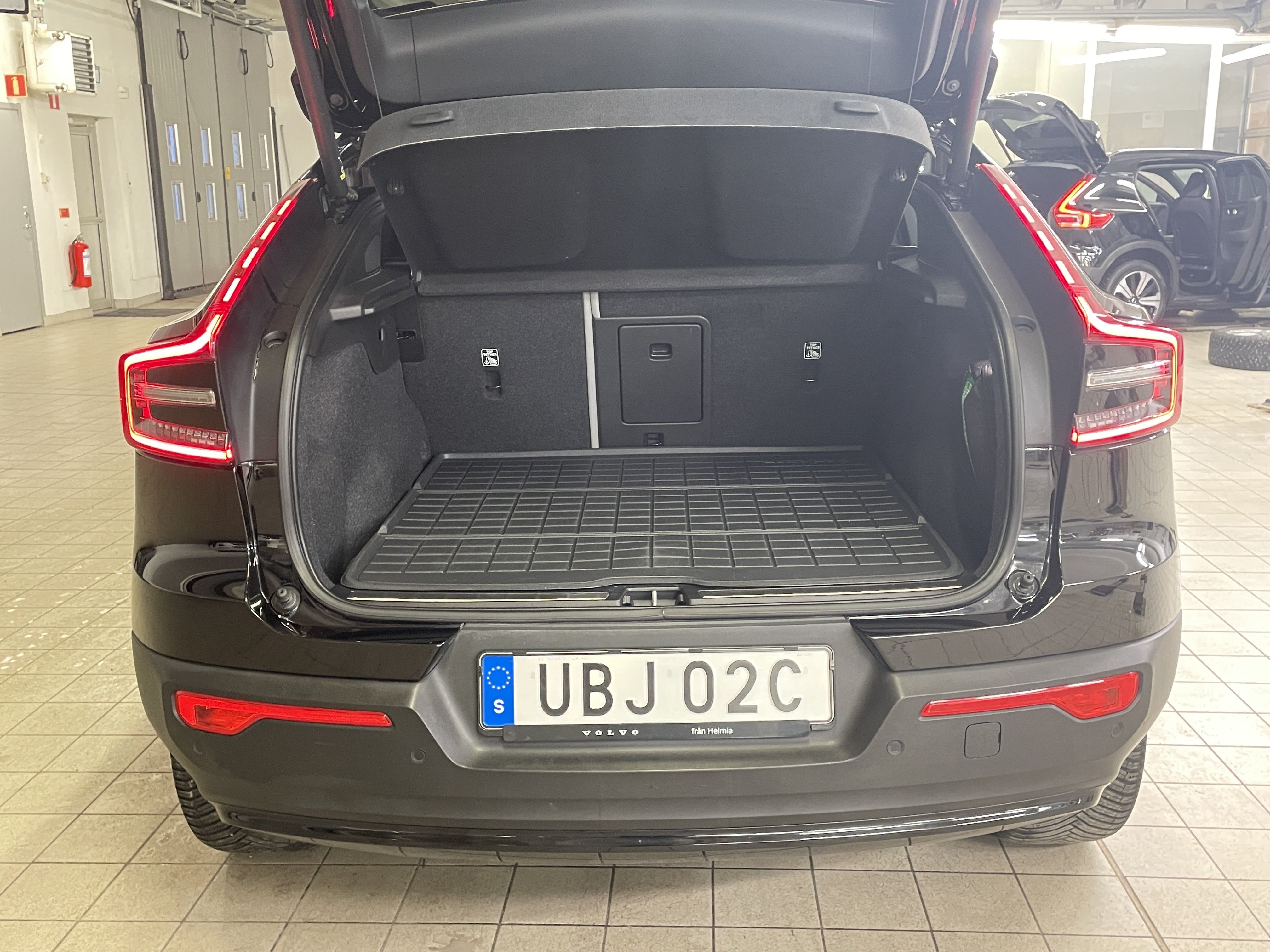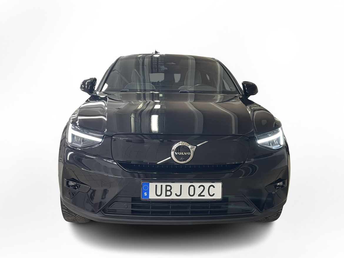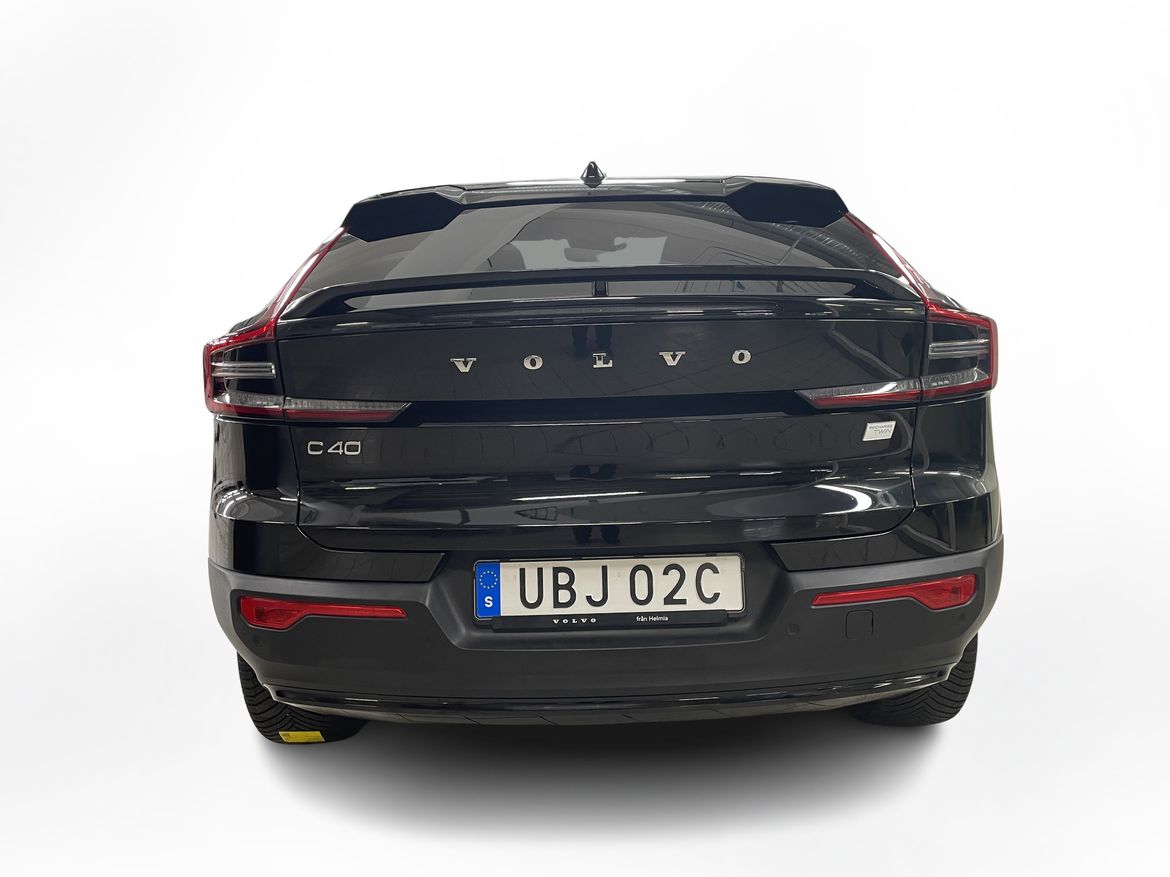 En svart begagnad Volvo C40 Recharge Twin motor som är tillverkad 2022 med årsmodell 2023 och har utrustningspaketet Ultimate med 408 hk. Fordonet finns i Karlstad med reg. nummer UBJ02C, har automat-växellåda och mätarställning är 6.886 mil. Fordonet har totalt 5 st sittplatser och är kategoriserad som liten suv.
