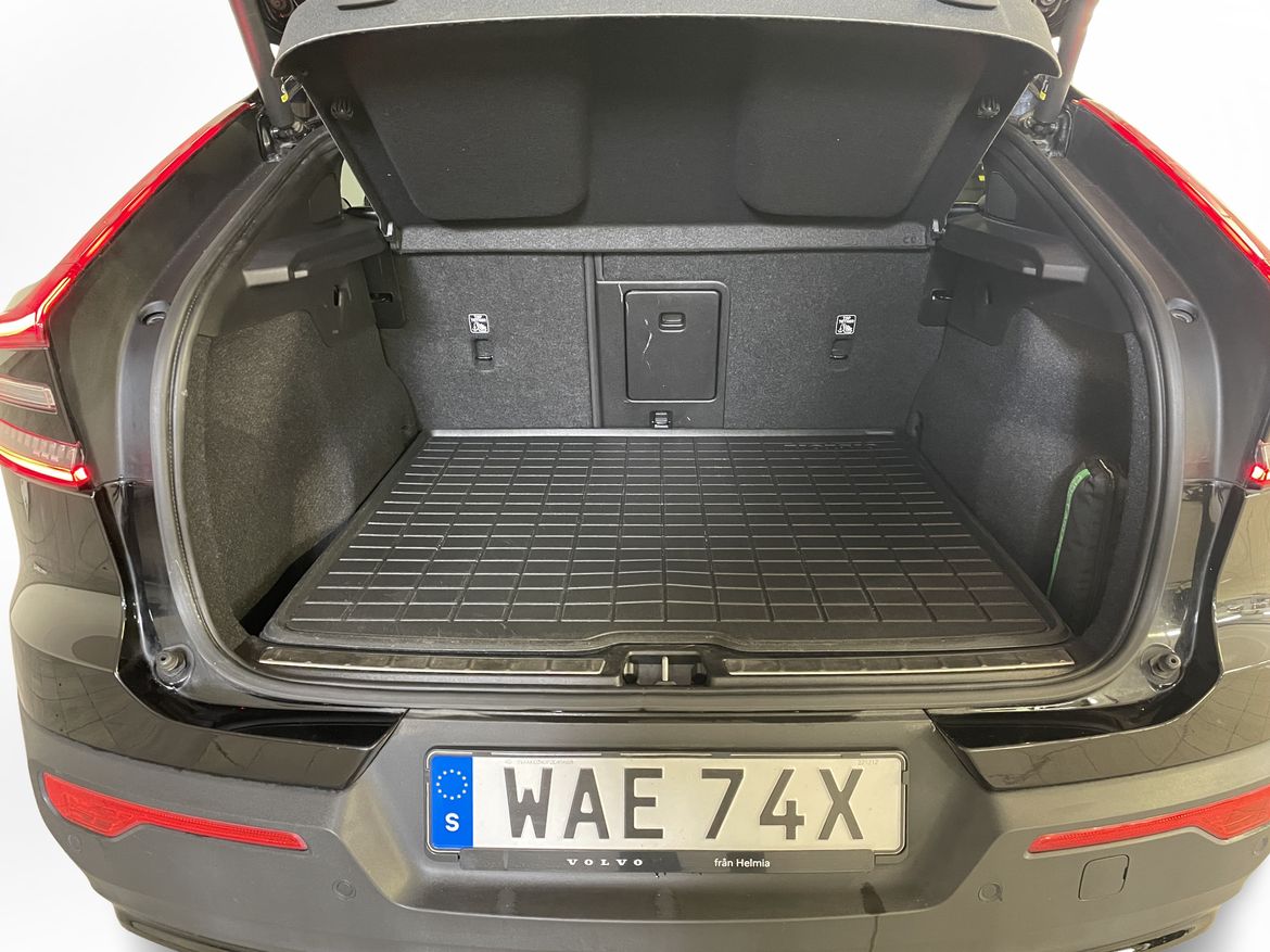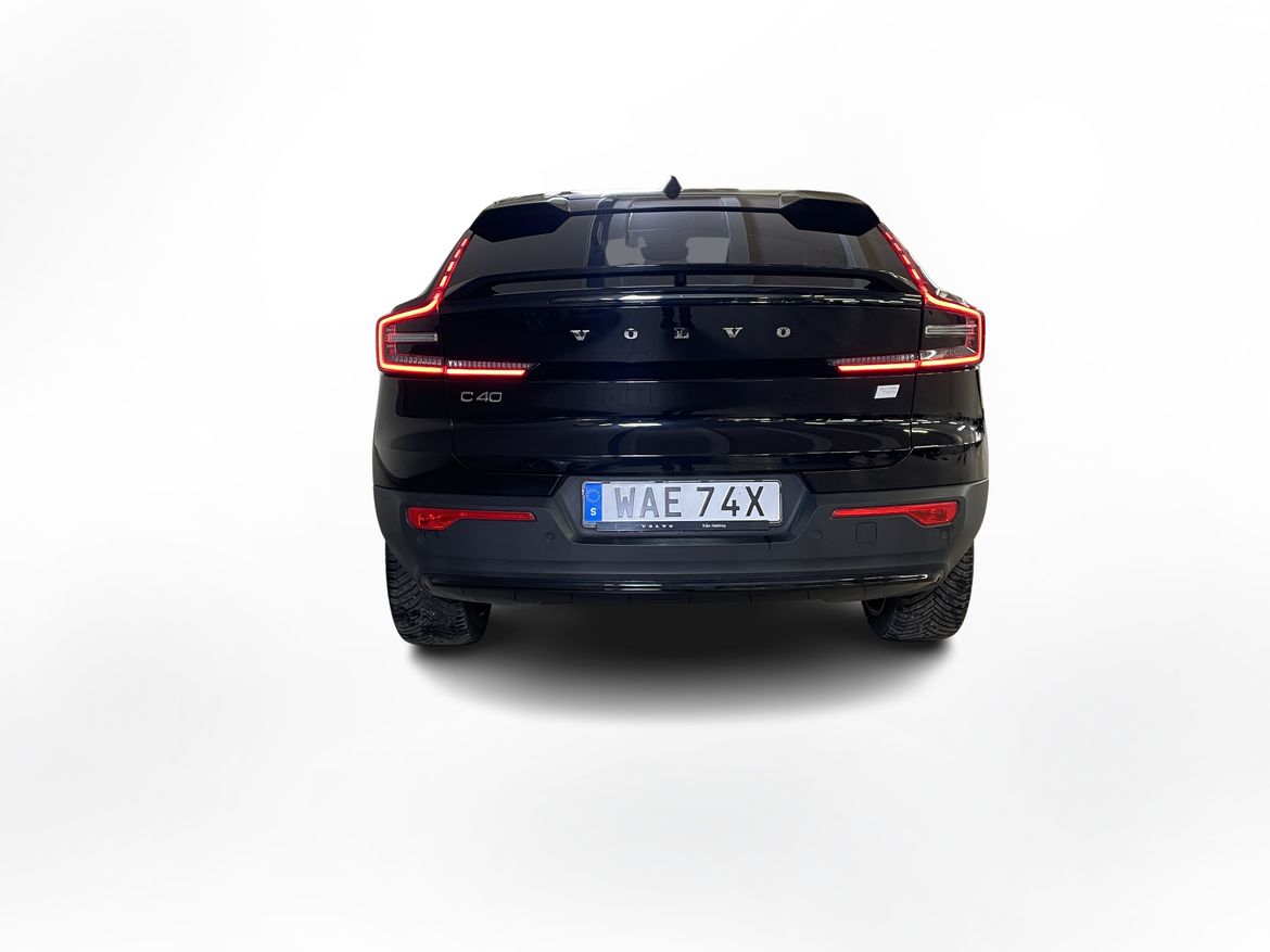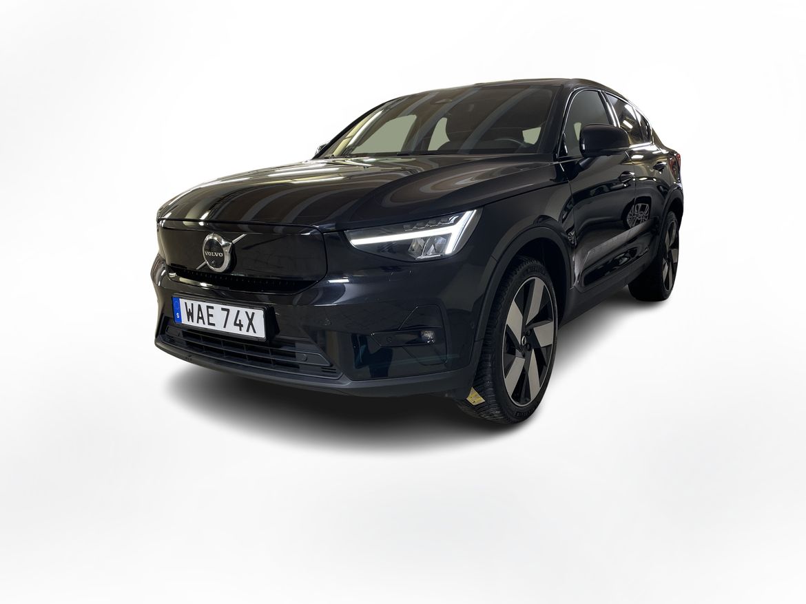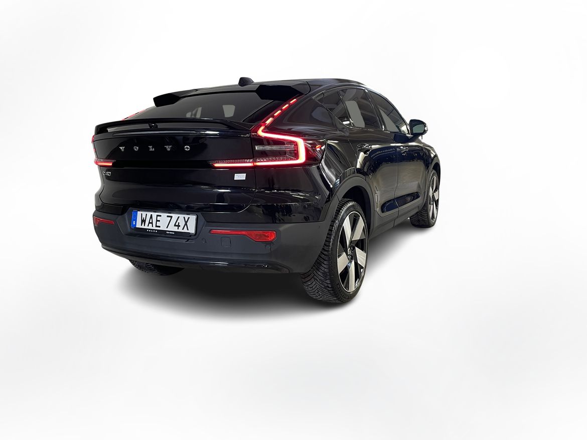 En svart begagnad Volvo C40 Recharge Twin motor som är tillverkad 2022 med årsmodell 2023 och har utrustningspaketet Ultimate med 408 hk. Fordonet finns i Karlstad med reg. nummer WAE74X, har automat-växellåda och mätarställning är 5.000 mil. Fordonet har totalt 5 st sittplatser och är kategoriserad som liten suv.