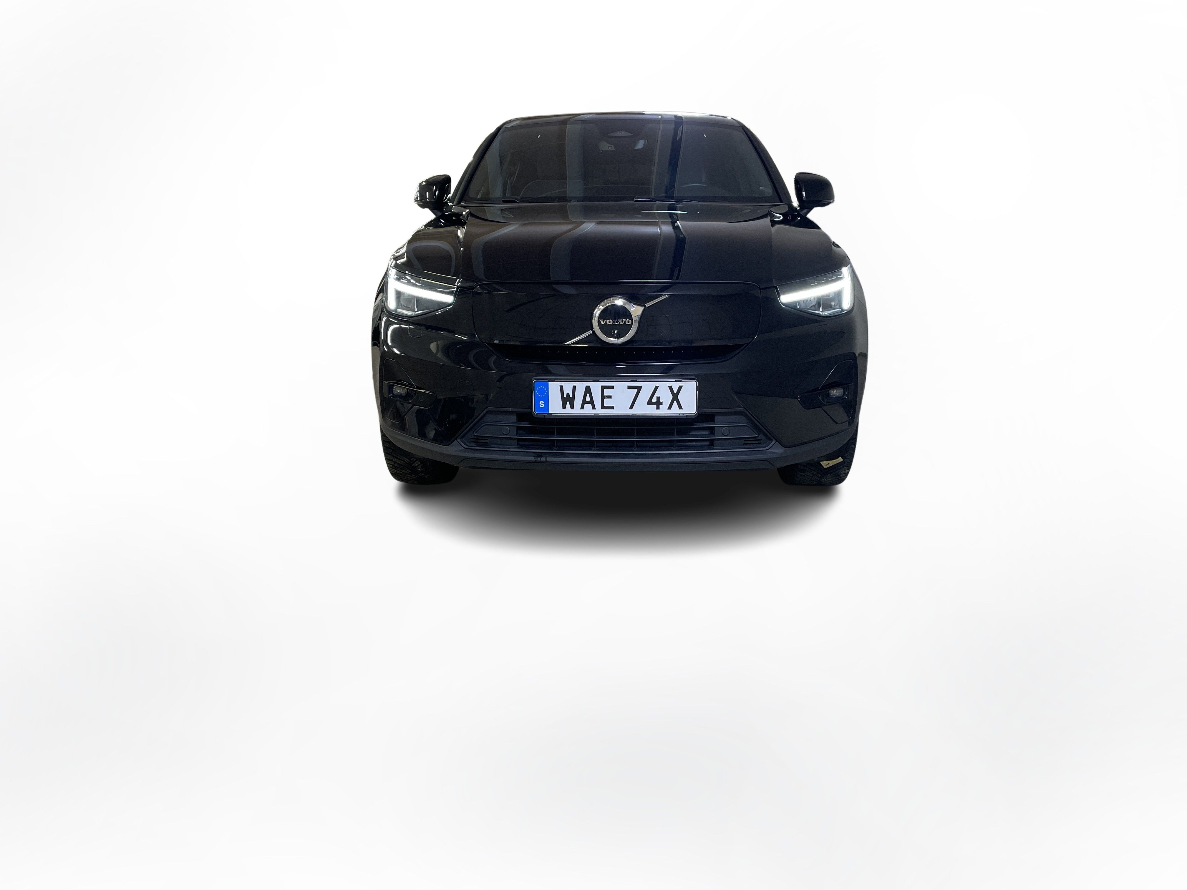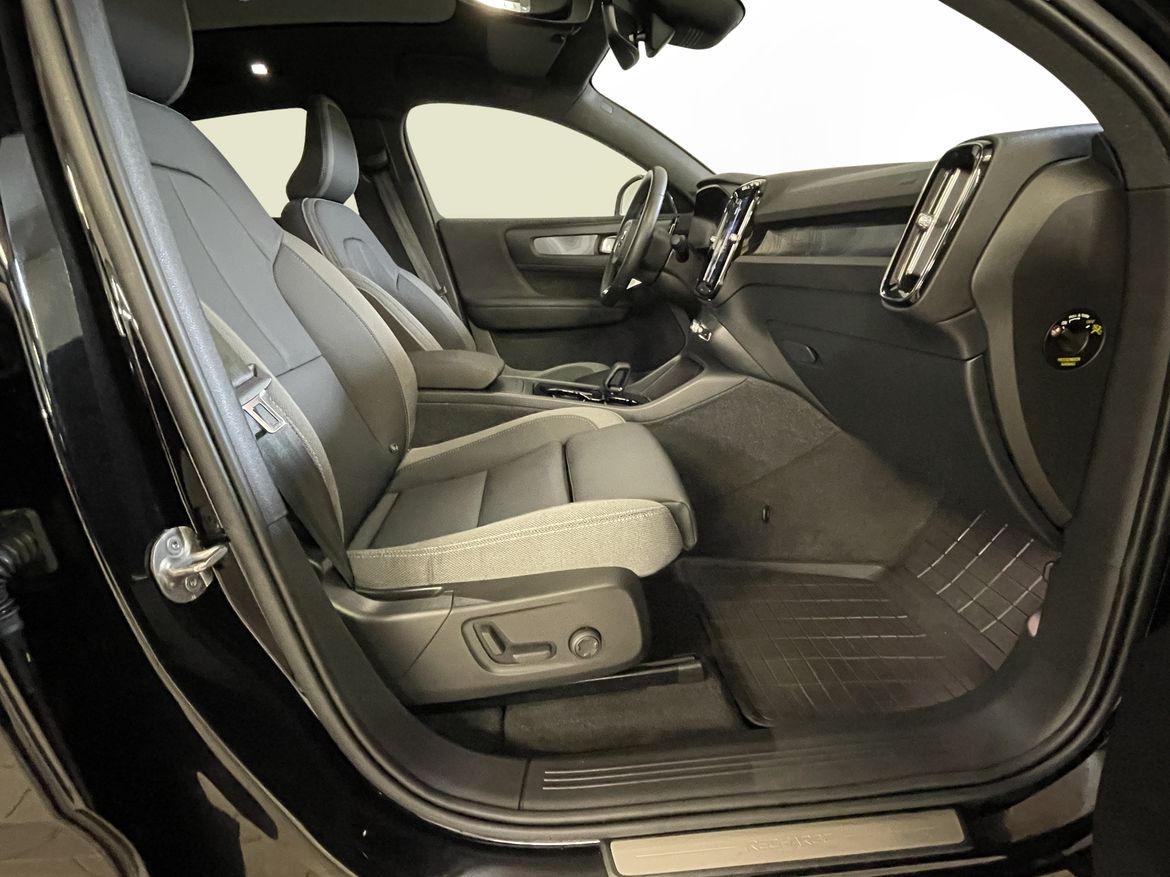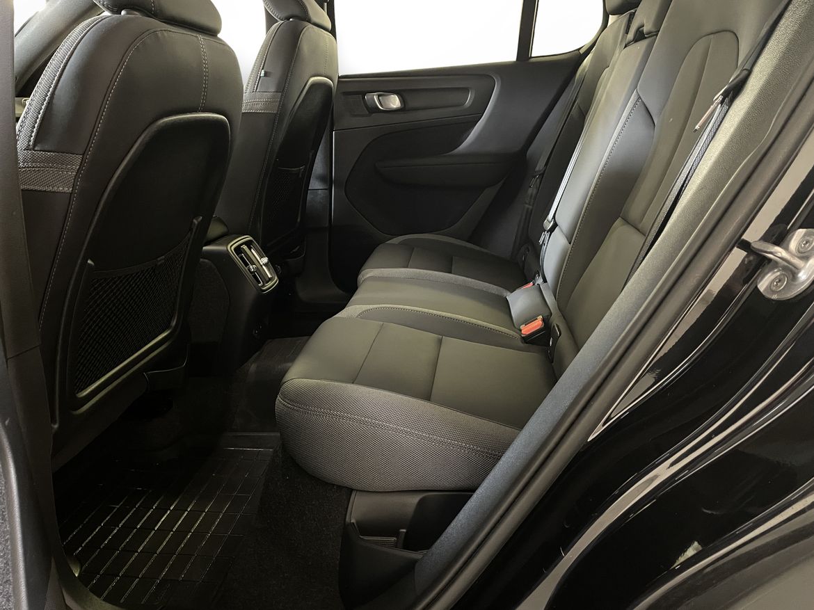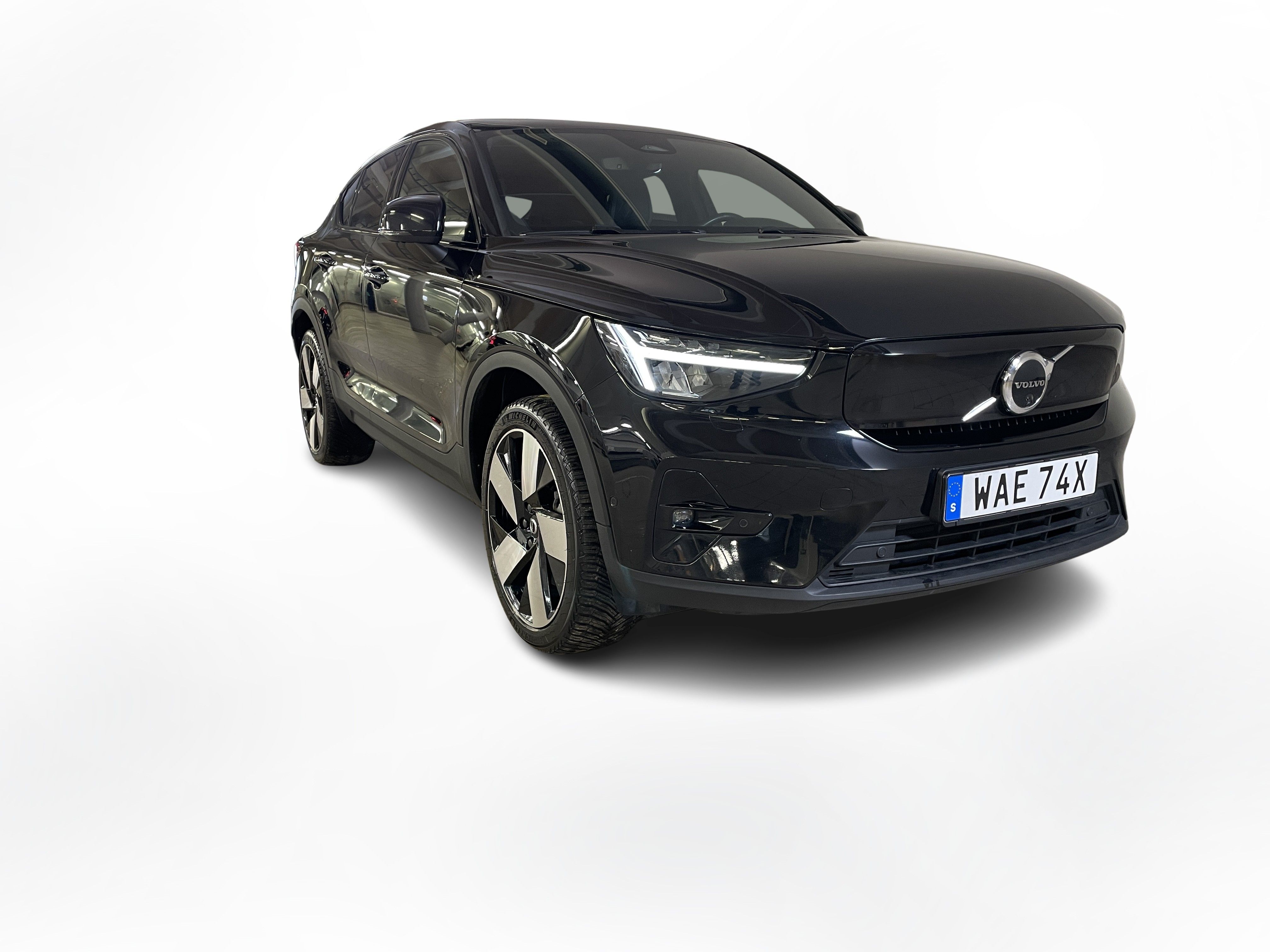 En svart begagnad Volvo C40 Recharge Twin motor som är tillverkad 2022 med årsmodell 2023 och har utrustningspaketet Ultimate med 408 hk. Fordonet finns i Karlstad med reg. nummer WAE74X, har automat-växellåda och mätarställning är 5.000 mil. Fordonet har totalt 5 st sittplatser och är kategoriserad som liten suv.