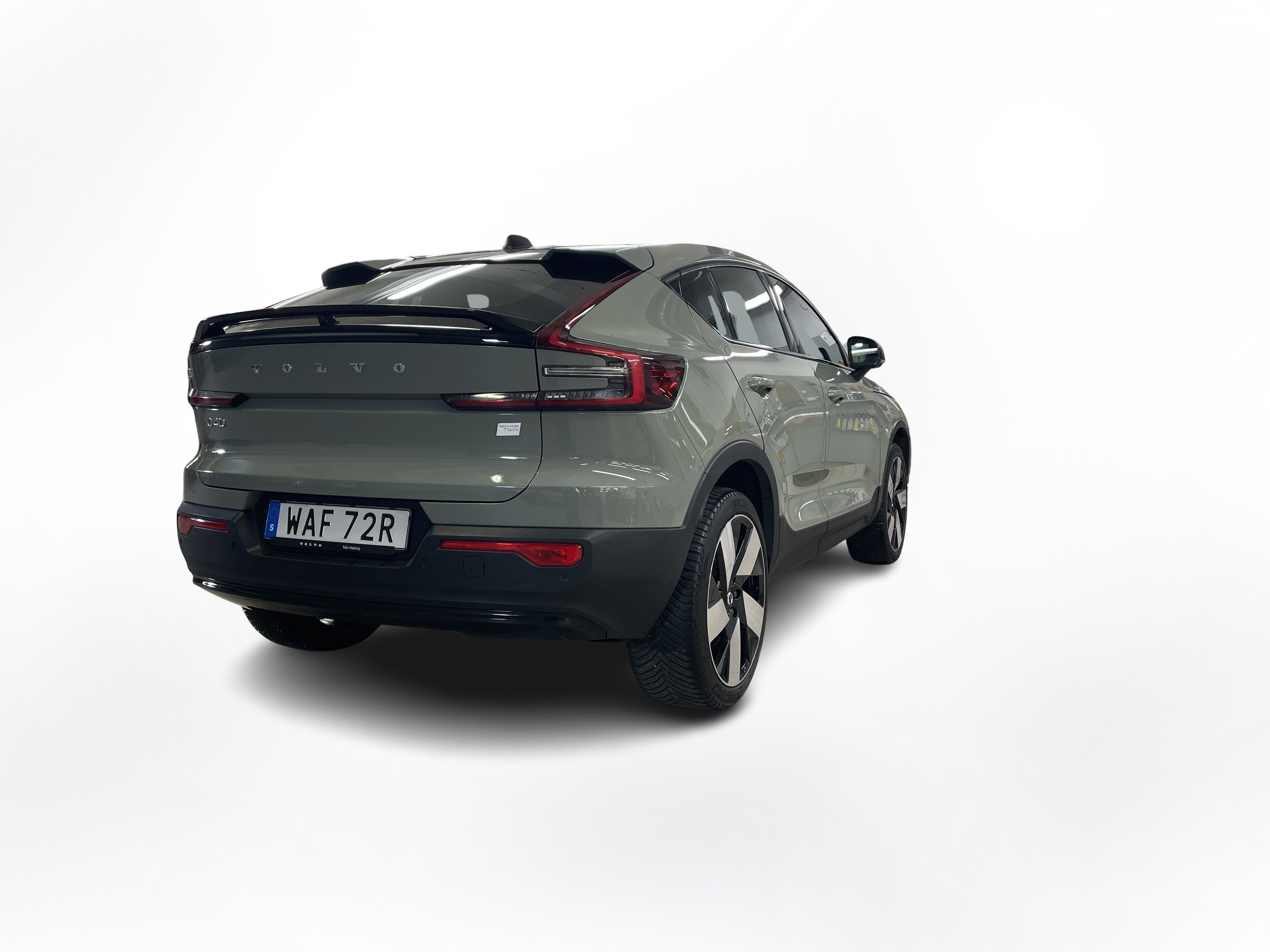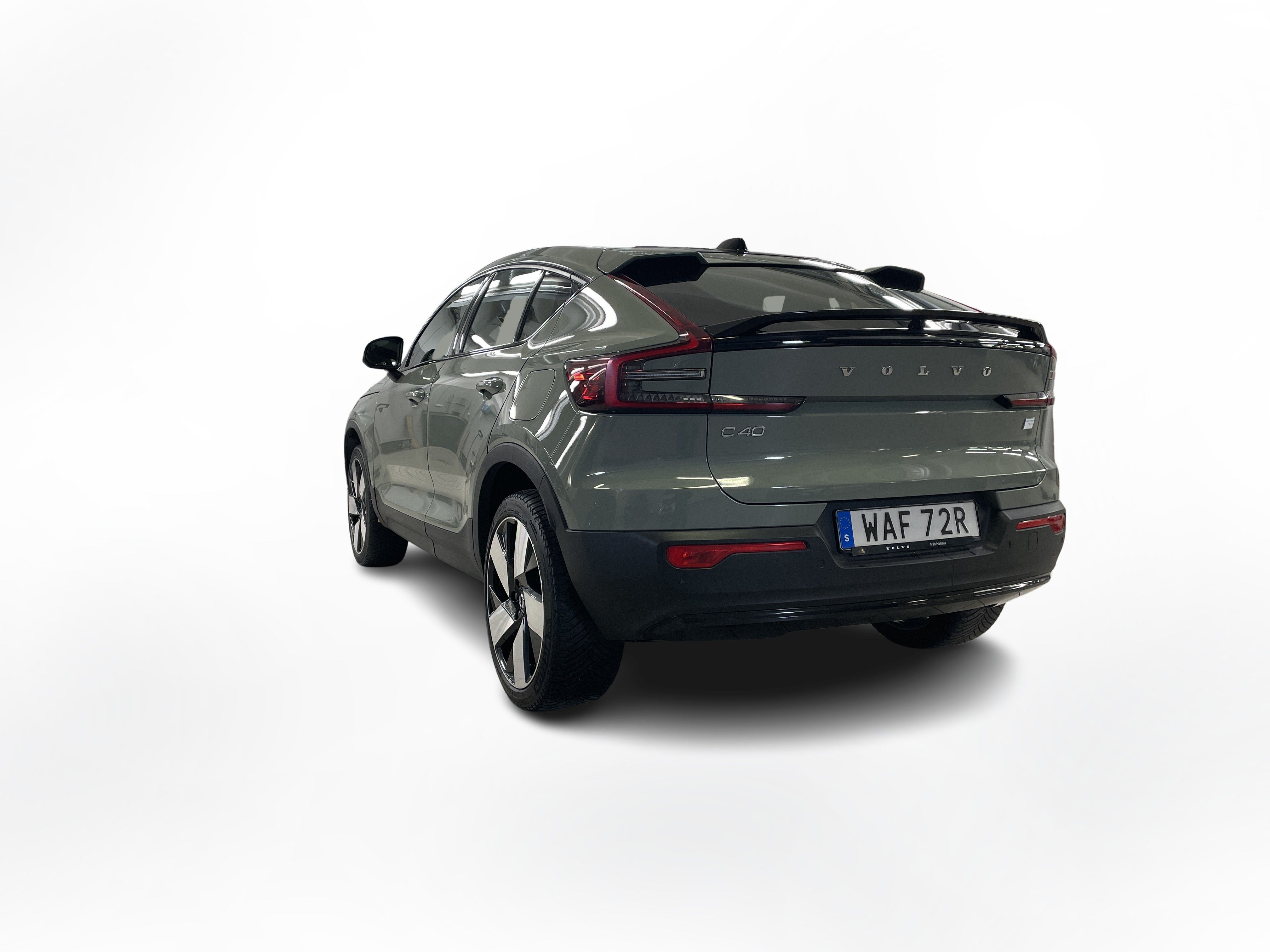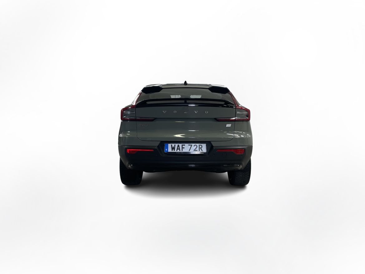 En grön begagnad Volvo C40 Recharge Twin motor som är tillverkad 2022 med årsmodell 2023 och har utrustningspaketet Core med 408 hk. Fordonet finns i Karlstad med reg. nummer WAF72R, har automat-växellåda och mätarställning är 9.441 mil. Fordonet har totalt 5 st sittplatser och är kategoriserad som liten suv.