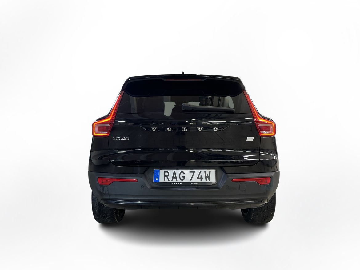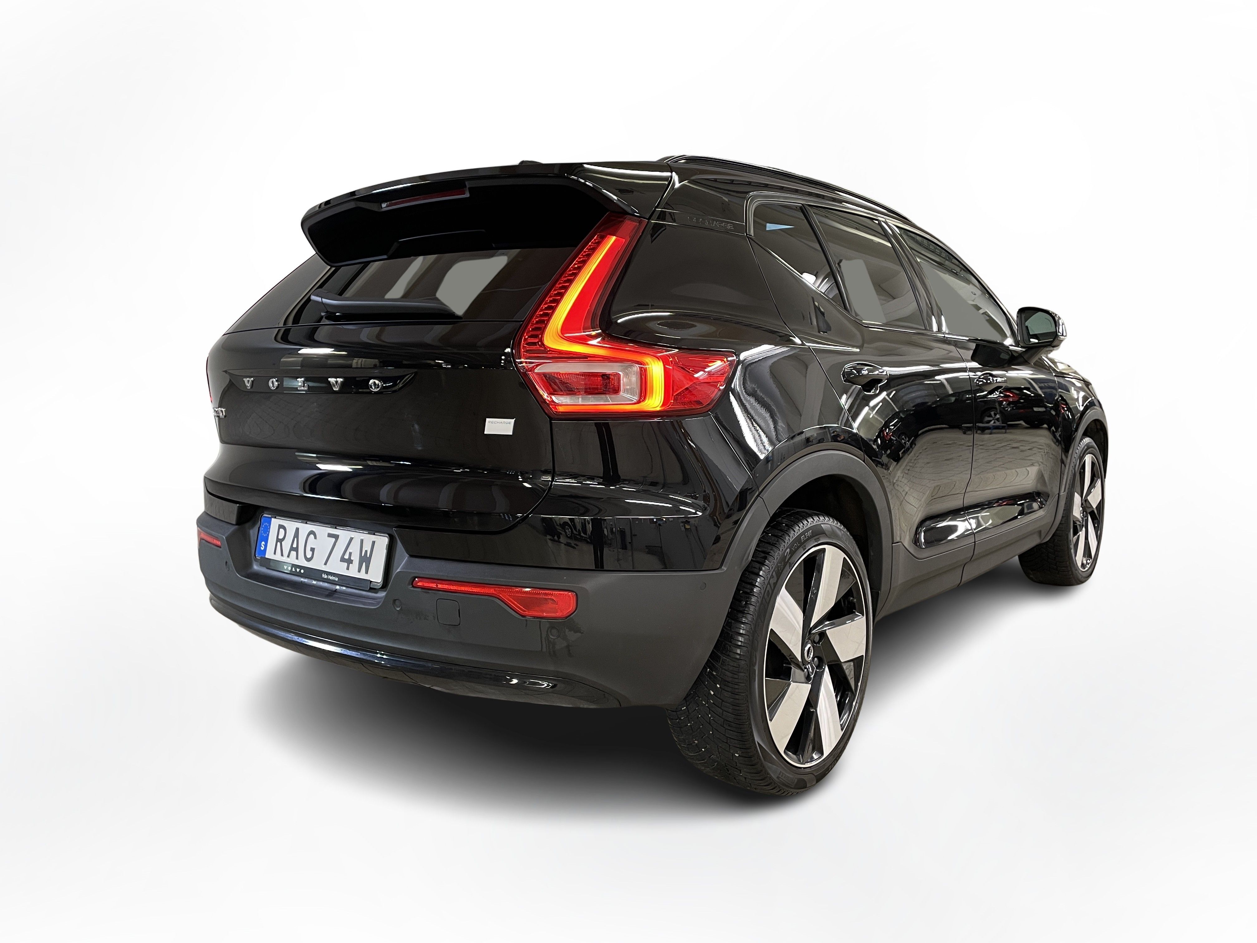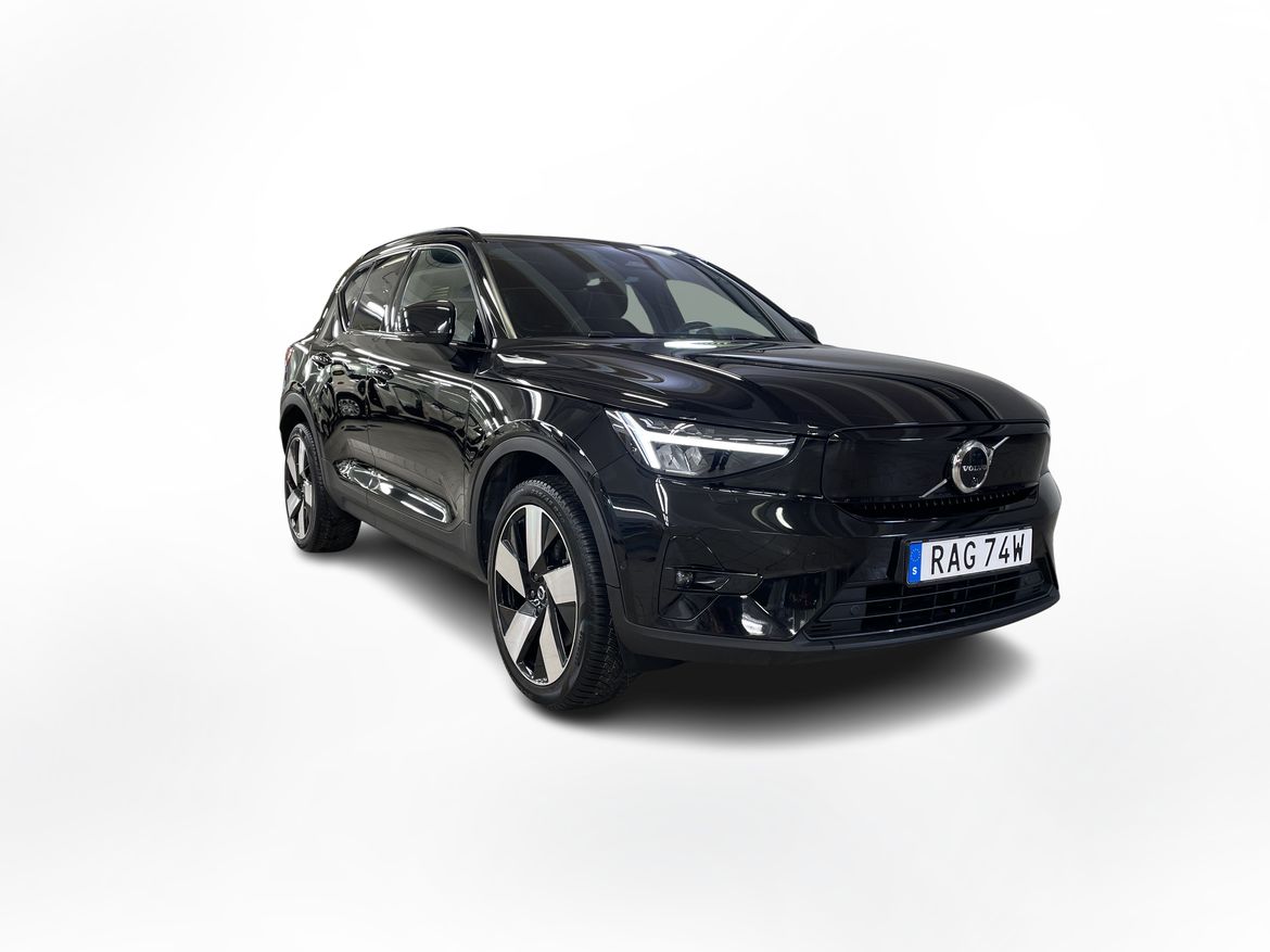 En svart begagnad Volvo XC40 Recharge Single Motor som är tillverkad 2023 med årsmodell 2023 och har utrustningspaketet Ultimate med 231 hk. Fordonet finns i Karlstad med reg. nummer RAG74W, har automat-växellåda och mätarställning är 5.223 mil. Fordonet har totalt 5 st sittplatser och är kategoriserad som liten suv.