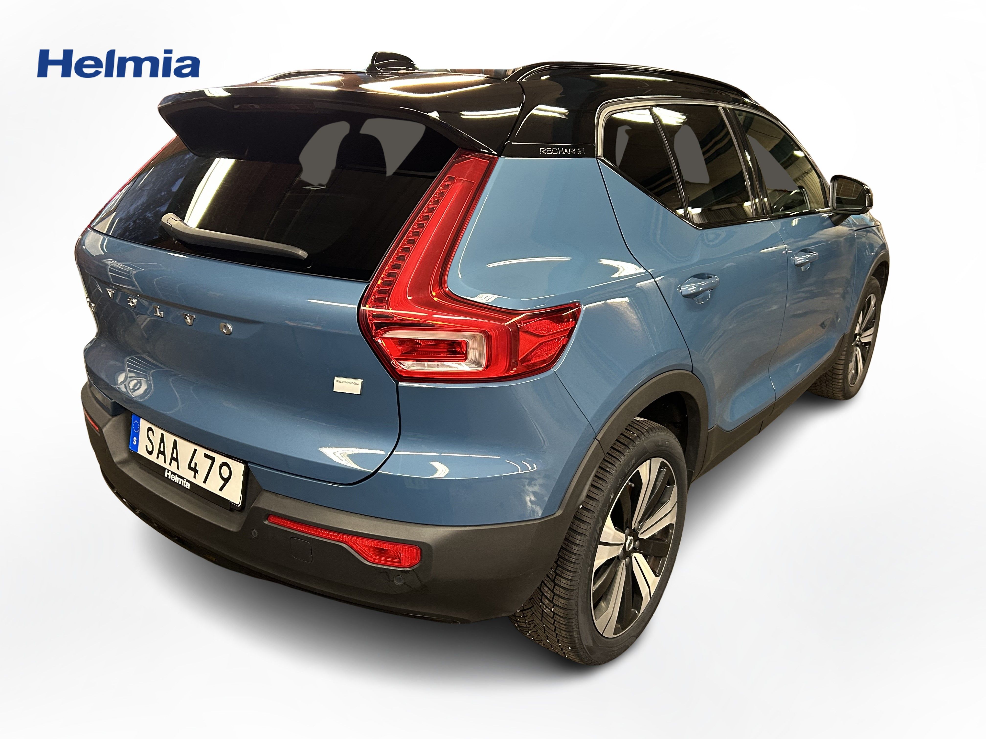 En blå begagnad Volvo XC40 Recharge Single Motor som är tillverkad 2022 med årsmodell 2023 och har utrustningspaketet Plus med 231 hk. Fordonet finns i Karlskoga med reg. nummer SAA479, har automat-växellåda och mätarställning är 9.155 mil. Fordonet har totalt 5 st sittplatser och är kategoriserad som liten suv.