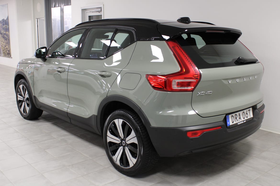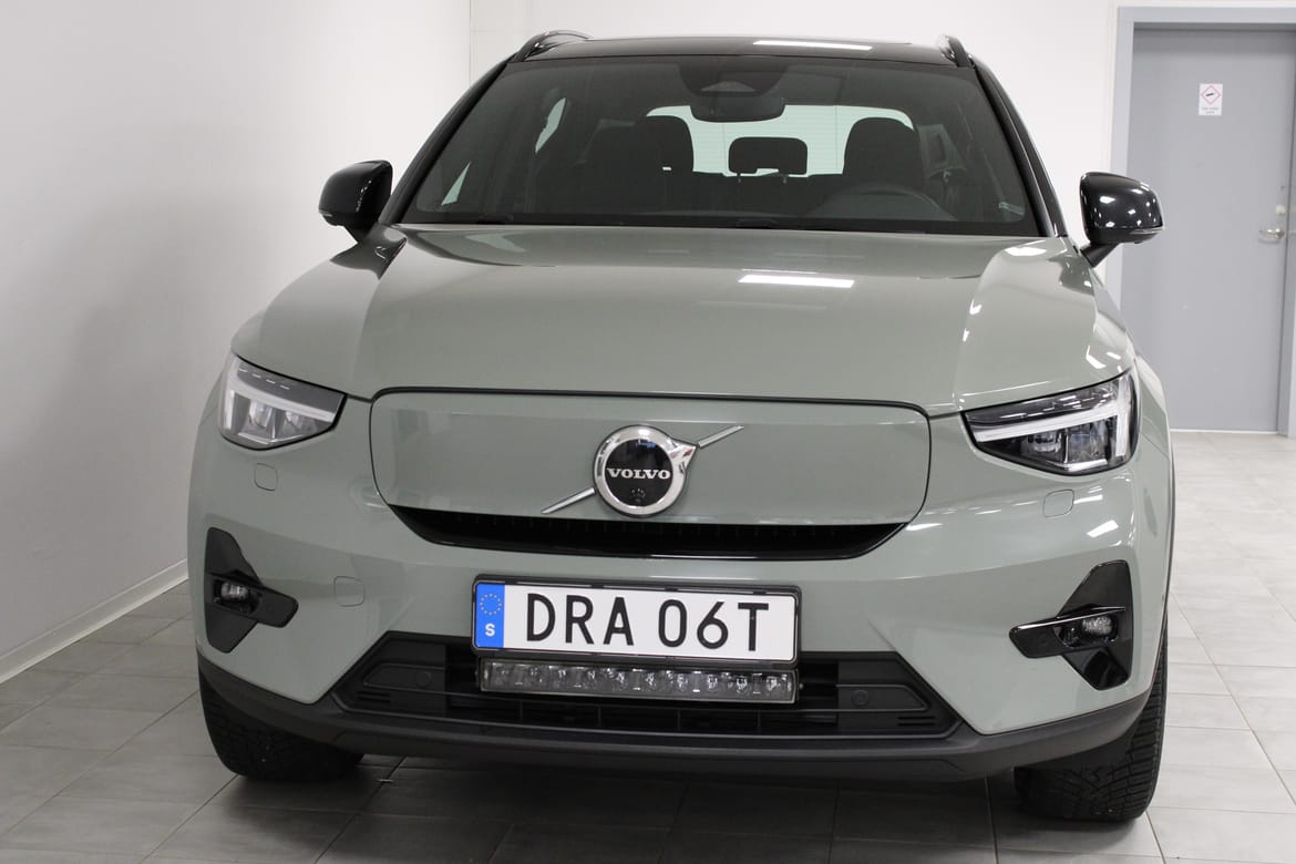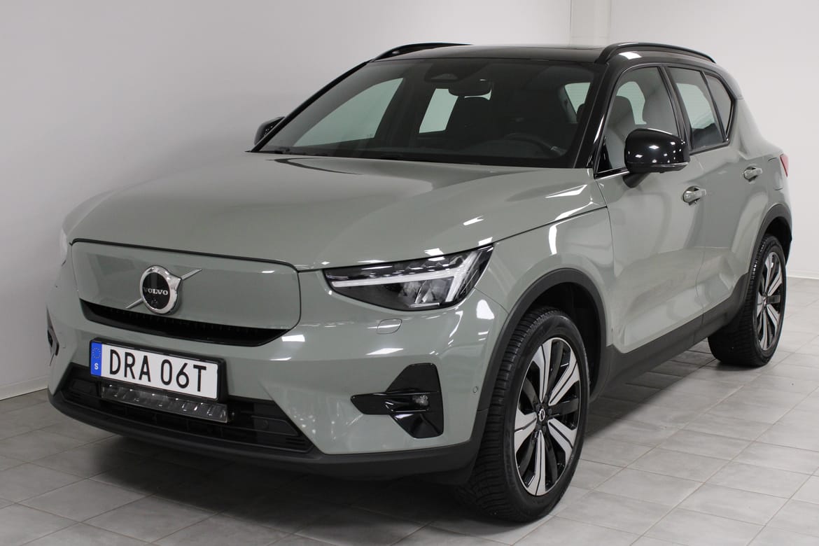 En grön begagnad Volvo XC40 Recharge Twin motor som är tillverkad 2022 med årsmodell 2023 och har utrustningspaketet Ultimate med 408 hk. Fordonet finns i Filipstad med reg. nummer DRA06T, har automat-växellåda och mätarställning är 9.409 mil. Fordonet har totalt 5 st sittplatser och är kategoriserad som liten suv.