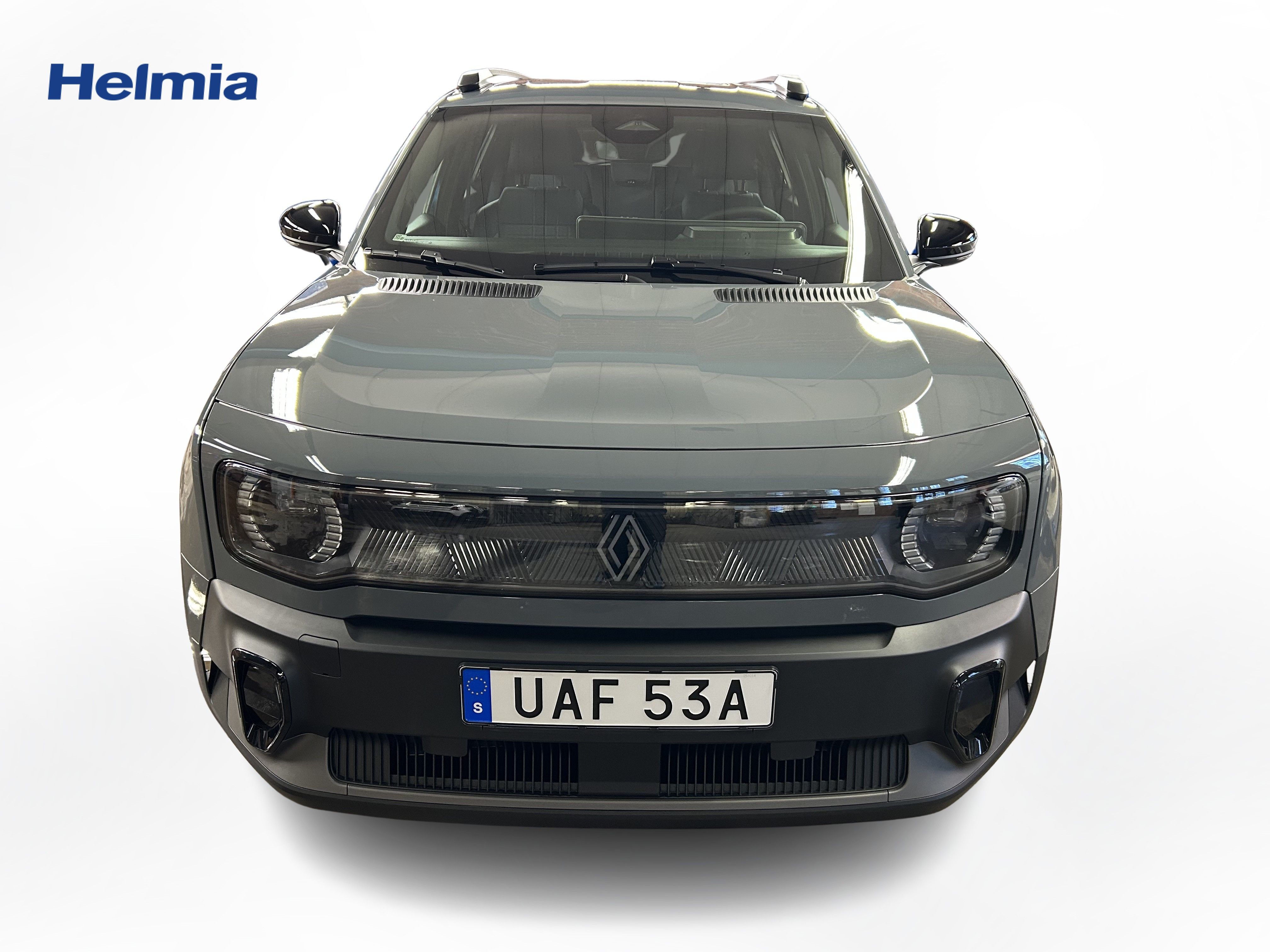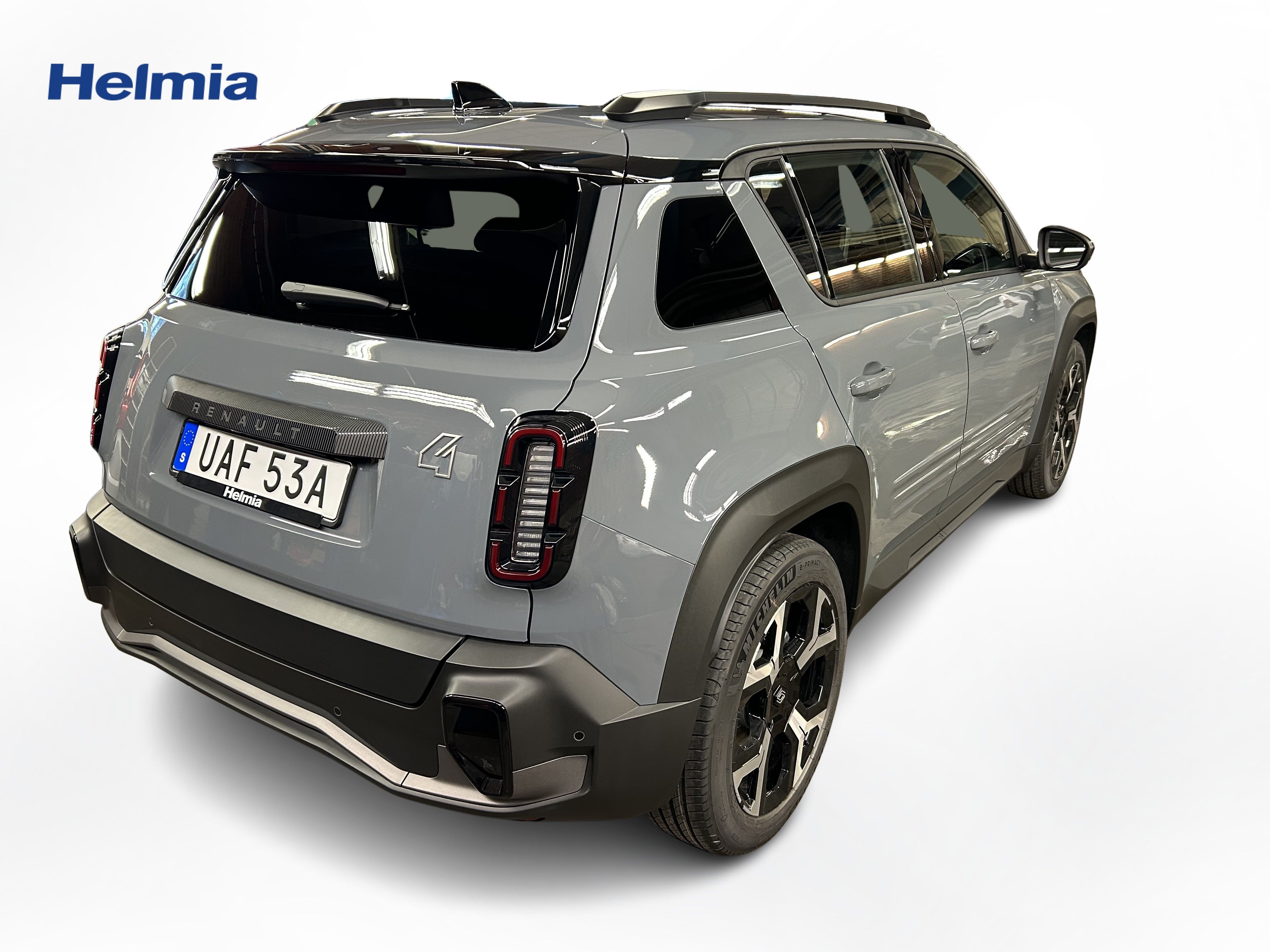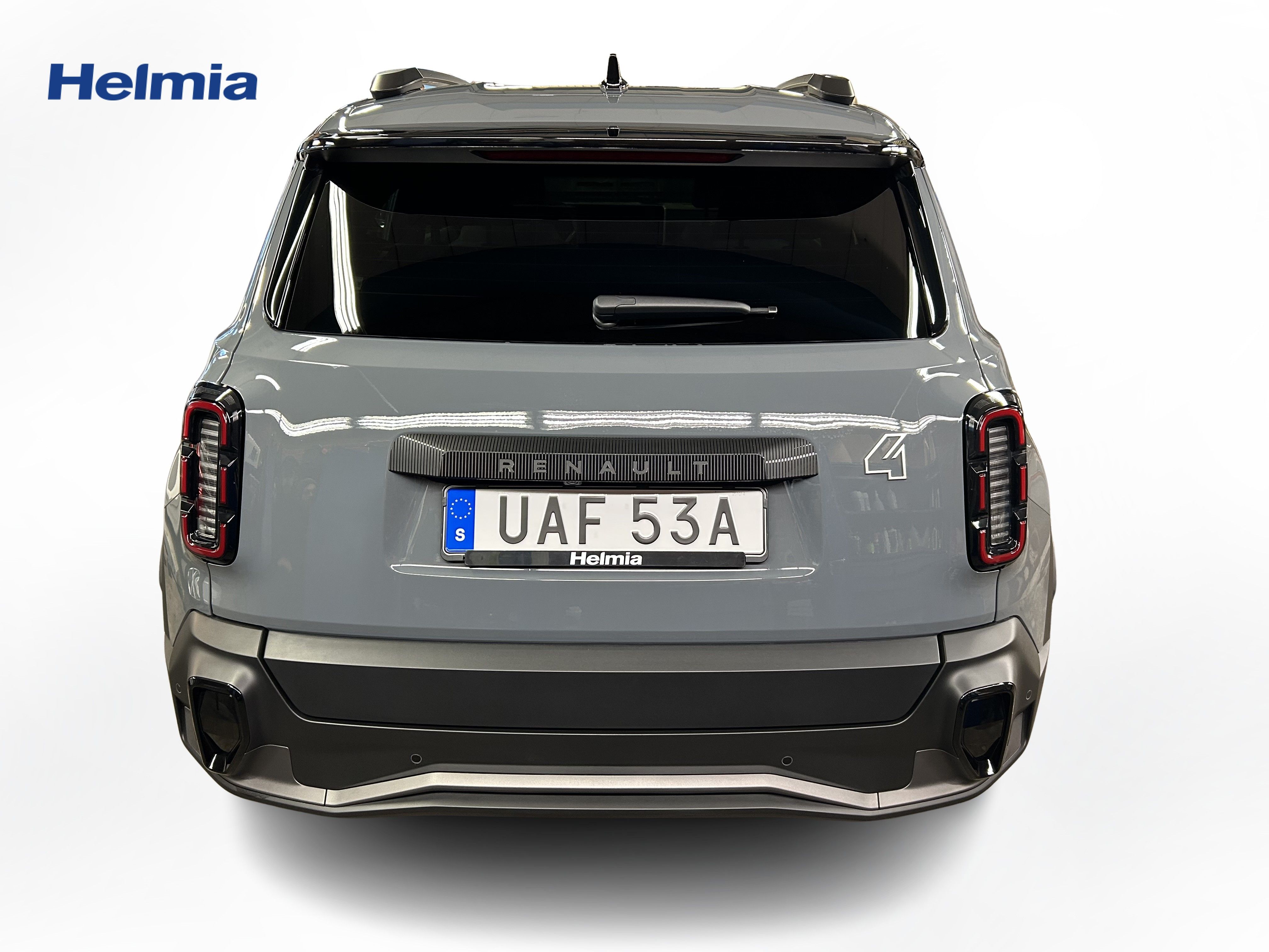 En grå ny Renault 4 E-Tech som är tillverkad 2025 med årsmodell 2026 och har utrustningspaketet med 150 hk. Fordonet finns i Karlskoga med reg. nummer UAF53A, har automat-växellåda och mätarställning är 0 mil. Fordonet har totalt 5 st sittplatser och är kategoriserad som liten suv.
